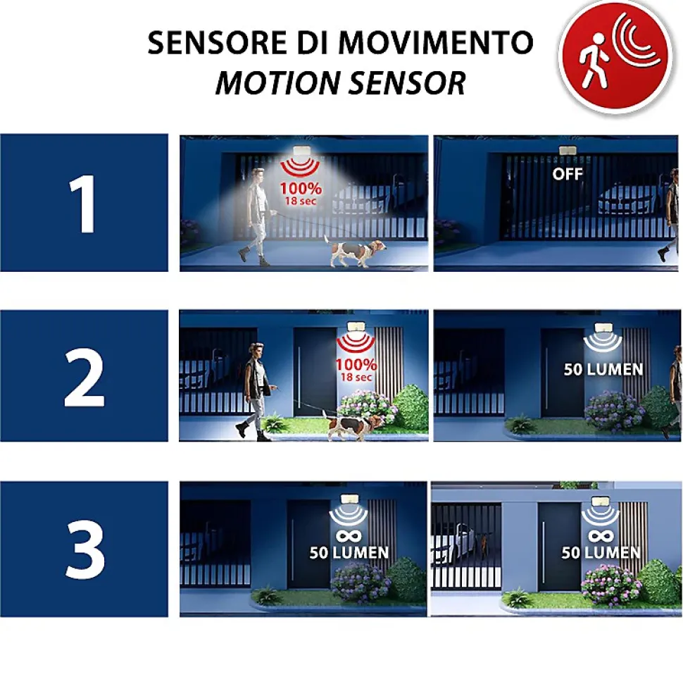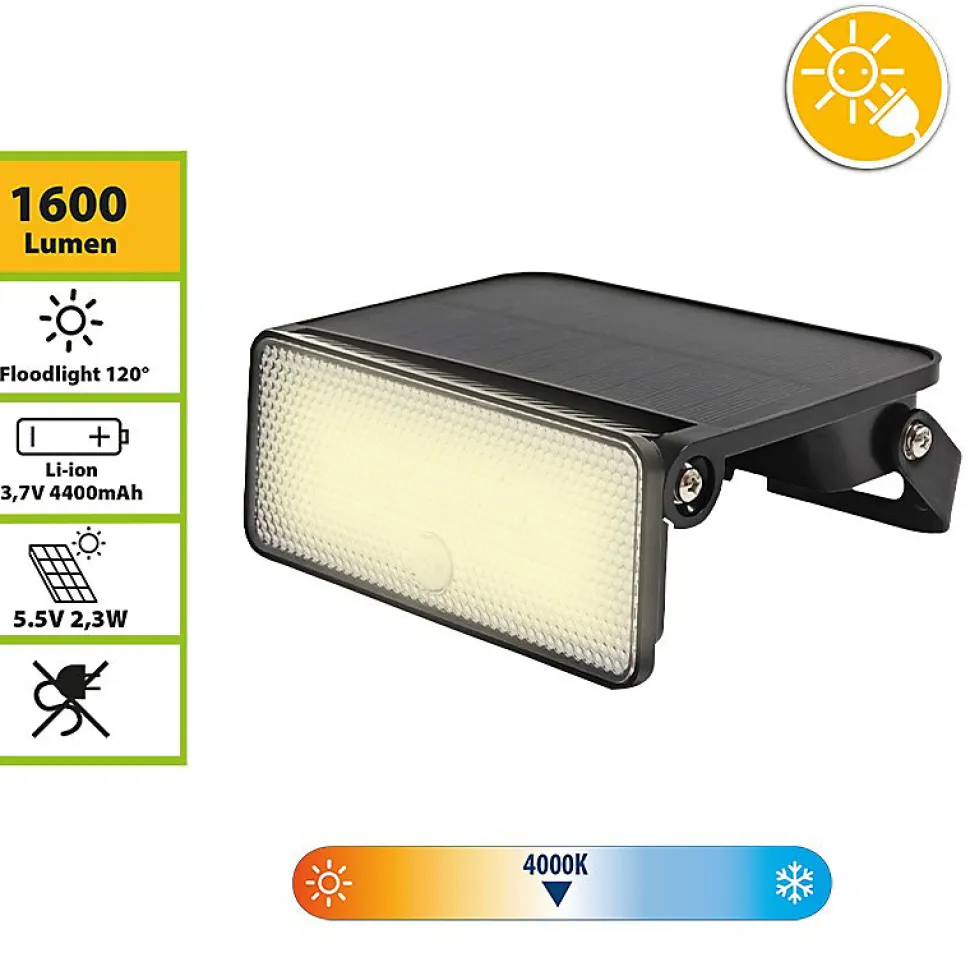 Ultra Lumineux : Le spot solaire 12W est équipé de 36 LED SMD qui fournissent un éclairage super puissant de 1600 lumens. Le panneau solaire est intégré au spot : compact et facile à installer, il est totalement sans câble. Il peut être posé, transporté ou, évidemment fixé au mur à l’aide de chevilles classiques. La batterie lithium de grande capacité de 4400mAh garantit une longue durée de vie de la batterie, même les jours sans soleil. Technologie de charge intelligente : le panneau solaire intégré convertit la lumière du soleil en électricité avec une grande efficacité (2,3 W monocristallin). Le système de charge de dernière génération rend le panneau solaire rechargeable même par temps nuageux ou pluvieux. Éclairage garanti 365 jours par an. Facile à utiliser : Le spot se charge le jour et s’allume automatiquement la nuit. 3 modes de fonctionnement : avec détecteur de mouvement, détecteur de mouvement avec lumière de courtoisie ou toujours allumé. Lumière extérieure polyvalente : le spot est conçu pour être en extérieur. Il est donc résistant à l’eau (certifié IP54), aux UV et aux agents atmosphériques (polycarbonate hyper résistant). Le spot résiste aux conditions climatiques extrêmes, telles que la foudre, la pluie, la neige. Parfait pour jardin, terrasse, cour, garage, terrain, parking, entreprise, etc. La lumière blanche est naturelle (4000K) : ni trop chaude, ni trop froide. Facile à installer : Cette lampe solaire d’extérieur est facile à installer. Pas besoin d’apporter un câble électrique, de creuser des tranchées etc… elle est entièrement sans fil. Et c’est aussi une belle économie : 0 euros sur la facture ! Elle peut être fixée au mur : la hauteur d’installation recommandée est d’environ 2 à 4 mètres. Produit robuste et design moderne.