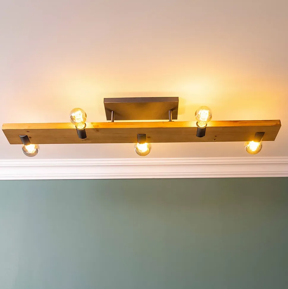 Le plafonnier MERTES 5L noir/bois est un luminaire élégant qui combine métal et bois pour un design moderne et chaleureux. Il est équipé de cinq douilles E27, compatibles avec des ampoules jusqu’à 40W, mais celles-ci ne sont pas incluses. Ce modèle offre une longueur d’environ 115 cm, ce qui le rend idéal pour éclairer de grandes pièces comme un salon ou une salle à manger. Son indice de protection IP20 le destine à un usage intérieur.