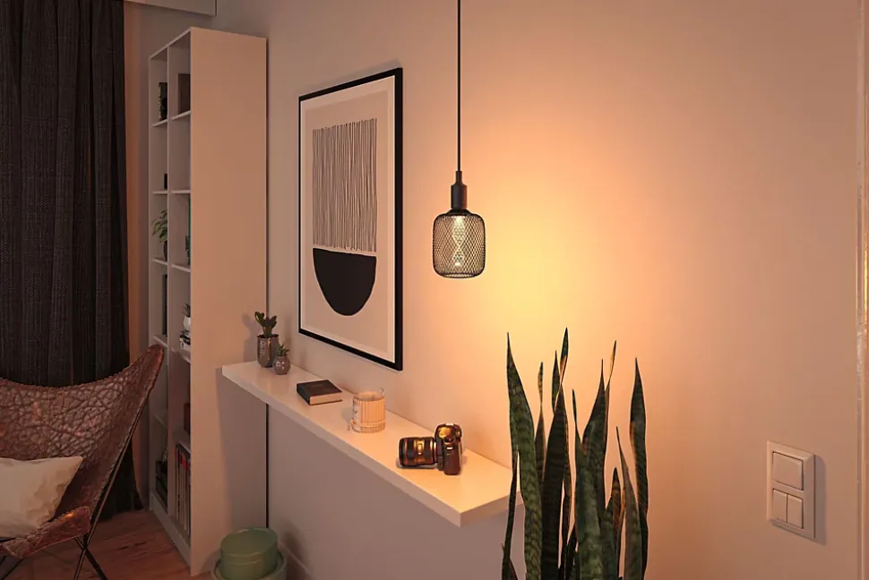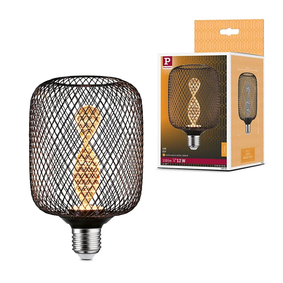 L’ampoule LED Metallic Glow associe une lumière dorée discrète à une coupelle métallique noire décorative. Grâce à la combinaison d’un cylindre intérieur gravé au laser et d’une fine structure grillagée, ces ampoules conviennent parfaitement aux suspensions ou aux lampes à poser avec douille E27. L’élément lumineux situé à l’extrémité du cylindre intérieur diffuse une lumière parfaitement dirigée vers le bas. Le design intemporel rencontre ici la technologie LED efficace et assure un éclairage d’ambiance confortable et doré.