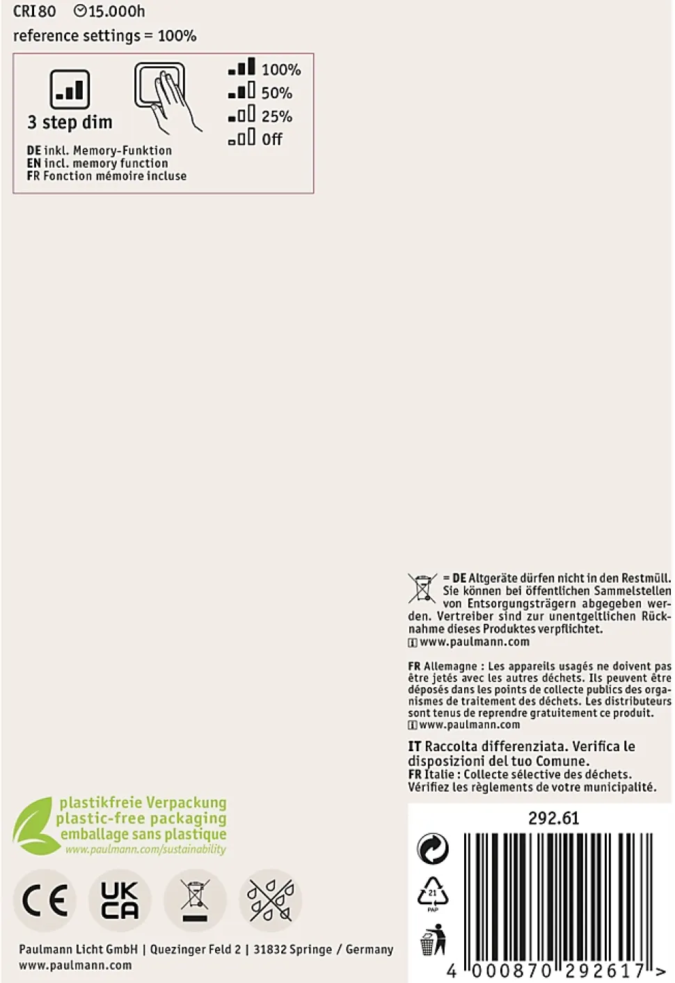 L’ampoule LED 160 lm Metallic Glow associe une lumière dorée discrète à une coupelle métallique décorative de couleur noir. Grâce à la combinaison d’un filament maintenu en forme par un petit tube de verre torsadé et d’une fine structure grillagée, ces ampoules conviennent parfaitement aux suspensions, aux appliques ou aux lampes à poser avec douille E27. Le design intemporel rencontre ici la technologie LED efficace et assure un éclairage d’ambiance confortable et doré. Le commutateur mural permet de grader l’ampoule à 3 niveaux différents pour une facette supplémentaire de conception.