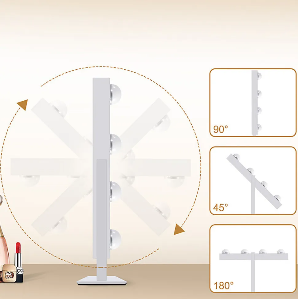 ÉCLAIRAGE DE MAQUILLAGE PROFESSIONNEL – Ce miroir de courtoisie Hollywood est équipé de 9 LED offrant trois températures de couleur différentes : blanc chaud et blanc neutre (plage de température de couleur de 3 000 à 6 500 K), ainsi qu’une luminosité réglable (10 % à 100 %). Facilement commutable par simple pression d’un bouton, il répond à divers besoins d’éclairage, de la chambre au salon, garantissant un résultat optimal pour chaque application de maquillage.MIROIR PIVOTANT À 360° – Ce miroir Hollywood est doté d’un cadre et d’une base en métal robustes. Il peut être utilisé sur un pied ou une coiffeuse et pivote à 360° vers le haut, vous permettant de trouver facilement l’angle parfait pour votre maquillage.3 MODES D’ÉCLAIRAGE ET LUMIÈRE VARIABLE – Ce miroir de courtoisie offre une lumière froide, chaude et naturelle pour parfaire votre maquillage. La fonction de luminosité réglable vous permet d’ajuster facilement l’intensité lumineuse selon vos préférences et votre environnement. Ce miroir peut également servir d’éclairage flexible pour lire, travailler ou créer une atmosphère romantique.Contrôle tactile intelligent et fonction mémoire : Changez simplement la couleur de la lumière avec le bouton « M » et ajustez la luminosité en appuyant longuement sur le bouton « P ». Le miroir de maquillage mémorise vos réglages d’éclairage et les rétablit automatiquement, vous faisant gagner du temps et vous évitant stress.FLEXIBLE ET PEU ENCOMBRANT : Ce miroir de maquillage lumineux est conçu pour être flexible. Doté d’une base en métal robuste et de deux trous de suspension, il peut être placé librement sur votre bureau ou accroché au mur, économisant ainsi de l’espace tout en répondant à vos besoins.