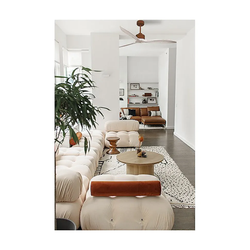 Latino SlimDC2Slim_CP8Wi132Le ventilateur de plafond Modulo Latino Slim est bien plus qu’un simple appareil de ventilation. Il combine les fonctions de ventilation estivale et de récupération de chaleur hivernale, offrant ainsi une solution polyvalente et moderne pour réguler la température de votre intérieur. En tant que régulateur thermique, il vous aide à réduire vos coûts de chauffage et de climatisation.Technologie et PerformanceÉquipé d’un moteur à courant continu DC, entièrement en cuivre et doté de roulements à billes auto-lubrifiés, ce ventilateur assure un fonctionnement silencieux et sans souci. Le moteur DC permet un contrôle précis de la vitesse avec ses 6 niveaux, tout en garantissant une faible consommation d’énergie. Découvrez notre gamme de ventilateurs Hyper Silence, pratiquement inaudibles jusqu’à la vitesse 3.Design et FlexibilitéLe Modulo Latino Slim est livré avec deux tiges de plafond de 12,5 cm et 25 cm, avec des options supplémentaires de 60, 120 et 180 cm. Les pales, disponibles en ABS léger et résistant ou en bois, peuvent être configurées en 2 ou 3 unités selon vos préférences. Le modèle P8 est idéal pour des pièces de 25 à 40 m² en été et de 60 à 90 m² en hiver.Caractéristiques TechniquesTaille : 132 cmMatériau : BoisPuissance : 3450-12480 m3/hRPM : 70-210Niveau sonore : 28-48 dBConsommation : 3-21 WattsFonctionnalités AvancéesChaque ventilateur de la série Modulo