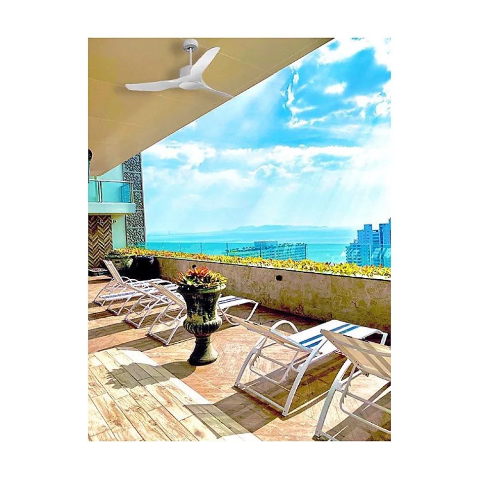 Modulo Regular Exterior IP44Modulo_DC4ext_P4WiDécouvrez le Modulo Regular Exterior, un ventilateur de plafond modulable conçu pour l’extérieur, idéal pour rafraîchir vos terrasses couvertes durant l’été. Grâce au kit IPX3, ce modèle de la gamme Modulo Regular s’installe aisément en extérieur.CaractéristiquesLe moteur est équipé de joints faciles à installer, garantissant l’étanchéité du moteur et des composants électroniques. Les pales, fabriquées en résine d’ABS, résistent aux variations d’humidité et de température.En option, un kit lumineux étanche est disponible, offrant un éclairage dimmable, une rareté parmi les ventilateurs d’extérieur.Le Modulo Regular Exterior assure un confort thermique optimal pour vos espaces extérieurs, tout en créant une barrière contre les insectes, rendant vos soirées estivales plus agréables.Performance et EfficacitéLes moteurs Modulo sont équipés de moteurs à courant continu DC avec roulements à billes auto-lubrifiés, garantissant un contrôle précis de la vitesse, une efficacité énergétique, un fonctionnement silencieux et une longue durée de vie. Ces moteurs consomment peu d’énergie et sont réputés pour leur fonctionnement Hyper Silence, pratiquement inaudible jusqu’à la vitesse 3.Installation et OptionsLe Modulo est livré avec deux tiges de plafond de 12,5