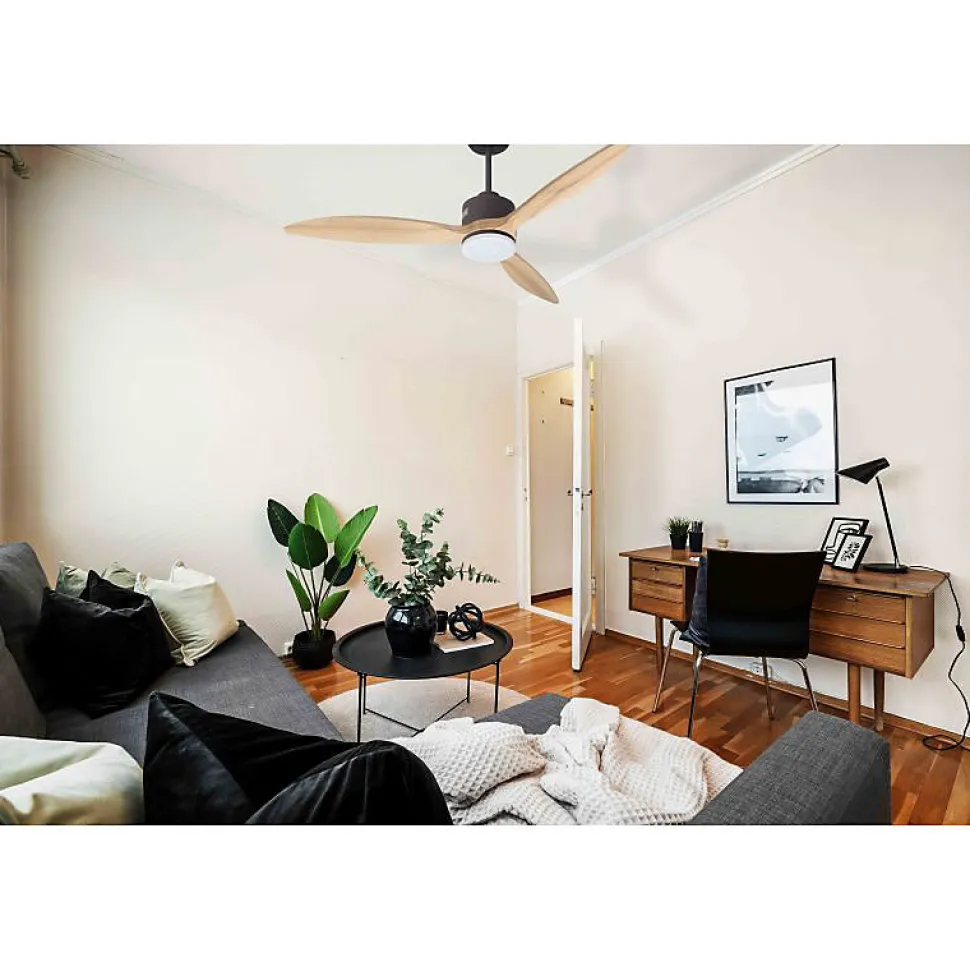 Modulo SlimDC6S_P8Sw132_L1sLe Modulo Slim est bien plus qu’un simple ventilateur de plafond. Ce modèle modulable agit également comme un destratificateur d’air, offrant une ventilation rafraîchissante en été et une récupération efficace de la chaleur en hiver. Son design moderne et ses fonctionnalités avancées en font un choix polyvalent pour toute saison.Performance et Économie d’ÉnergieÉquipé d’un moteur à courant continu (DC) entièrement en cuivre avec des roulements à billes auto-lubrifiés, le Modulo Slim garantit un fonctionnement silencieux et fiable. Ce moteur permet un contrôle précis de la vitesse avec ses 6 niveaux, tout en assurant une faible consommation d’énergie. Les ventilateurs de plafond Hyper Silence sont pratiquement inaudibles jusqu’à la vitesse 3, et seules les vitesses supérieures peuvent produire un léger bruit d’air.Installation et OptionsLe Modulo Slim est livré avec deux tiges de plafond de 12,5 cm et 25 cm, avec des options supplémentaires de 60, 120 et 180 cm pour s’adapter à différentes hauteurs de plafond. Les pales, disponibles en ABS léger et résistant ou en bois, peuvent être configurées en 2 ou 3 pales selon vos préférences. Le modèle P8 est idéal pour des pièces de 25 à 40 m² en été et de 60 à 90 m² en hiver.Caractéristiques Techniques Taille : 132 cm Matériau des pales : Bois Puissance :