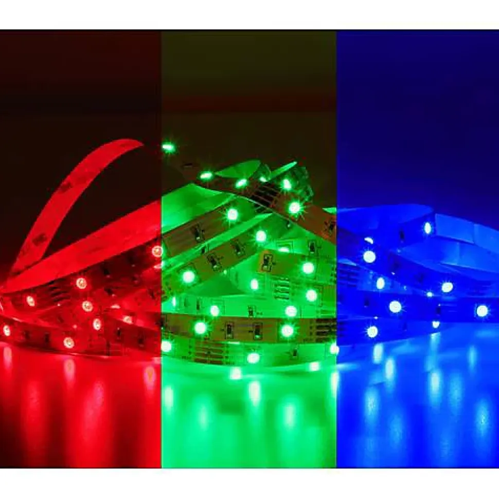 Ruban LED Müller-Licht 3 m, set complet avec connecteur mâle et télécommande. 150 LED RGB, couleur d’éclairage réglable, sectionnable pour un ajustement facile à la longueur désirée. Flexible et auto-adhésif pour une pose rapide, convient pour un usage intérieur (salon, chambre, cuisine, bureau). Caractéristiques principales : longueur 3 m, puissance 8 W, flux lumineux total 120 lm, 90 LED, tension 230 V, indice de protection IP20, matériau plastique. Consommation 8 kWh/1000 h. Livré avec notice d’utilisation.