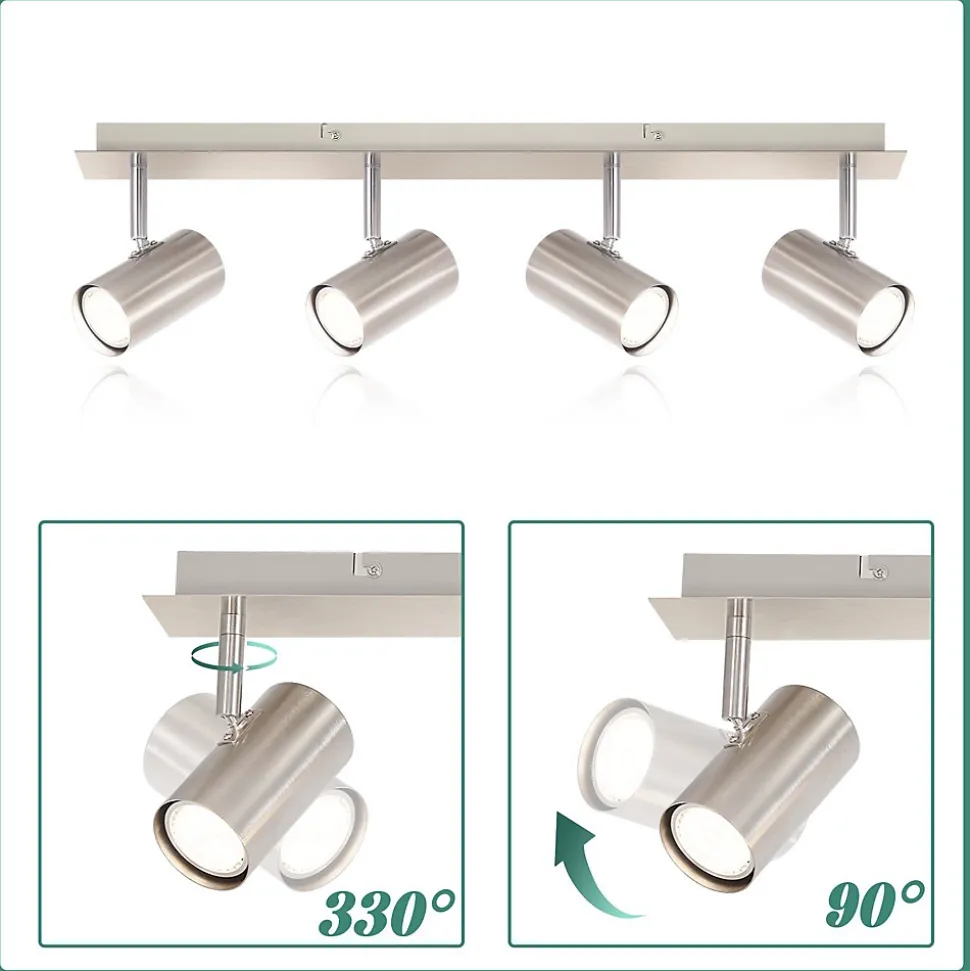 【Design moderne et matériau de haute qualité】 Le plafonnier LED GU10 à 4 ampoules est fabriqué dans un matériau métallique de haute qualité pour éviter l’humidité et la rouille sur la surface de la lampe. L’ensemble du corps de la lampe est chromé, et son apparence unique et son design simple et moderne n’apparaîtront brusques dans aucune scène.【Éclairage flexible】 Le spot de plafond a la fonction d’angle et de direction réglables et peut ajuster la plage et l’angle d’éclairage de 90° de haut en bas ou de 330° selon les besoins. Cela signifie que le plafonnier peut éclairer différentes zones de manière flexible et mettre en valeur certains objets ou décorations.【Douille GU10】 Notre spot de plafond pour couloir utilise une lampe LED GU10. Vous pouvez choisir vos ampoules GU10 préférées pour la personnalisation, et vous pouvez également prendre en charge les ampoules GU10 avec différentes températures de couleur, qu’elles soient blanc froid, blanc chaud ou blanc neutre. Ampoules non incluses.【Facile à installer et polyvalence】 Nos spots de plafond ont des étapes de montage simples et l’emballage contient des accessoires d’installation et des instructions. Le design simple du plafonnier Spots LED est idéal comme lumière d’accentuation ou comme lampe de salon. Son mécanisme de rotation et de rotation pratique lui permet d’être utilisé comme applique murale, plafonnier et autres applications d’éclairage.Large utilisation : le spot LED peut être librement ajusté et installé au plafond ou au mur. Vous pouvez l’utiliser comme applique murale ou plafonnier, adapté pour les chambres, les salons, les cuisines, les salles à manger, les couloirs, les vestiaires, les escaliers et bien plus encore. plus.