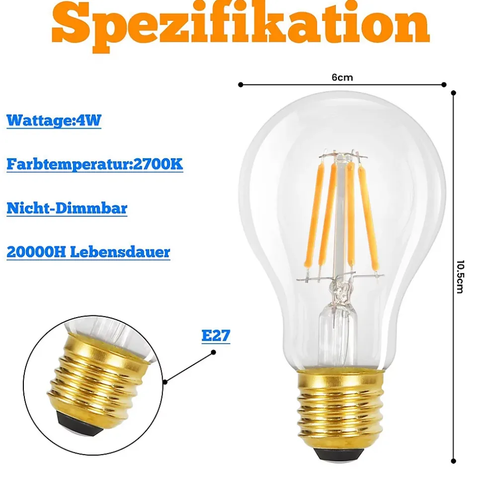 [Ampoule Edsion vintage] Notre ampoule LED 4 W a un abat-jour en verre et un filament LED, qui conserve le design de l’ampoule Edison traditionnelle mais utilise la technologie LED d’économie d’énergie. Il a un charmant look nostalgique.[Lampe à économie d’énergie blanc chaud] Cette lampe Edison avec douille E27 donne une lumière blanc chaud de 2700 K avec un angle de faisceau de 360°. Par rapport aux ampoules au tungstène traditionnelles, cette lampe ne consomme que 4 W, économise 90 % de la consommation d’énergie et a une durée de vie plus longue, jusqu’à 20 000 heures.[Sans scintillement et utilisation sûre] Cette ampoule est très stable, s’allume à l’électricité, n’a pas besoin d’être réchauffée et ne scintille pas, ce qui est rassurant.[Ampoule Edison largement utilisée] Combinant une technologie avancée avec un design rétro, cette lampe convient aux suspensions, ventilateurs de plafond, appliques murales, lampes de bureau et lampadaires. Cette ampoule émet une lumière chaude, elle peut répondre à presque tous vos besoins d’éclairage dans divers domaines. occasions.[Service client] Nous offrons une garantie d’achat de 24 mois pour les ampoules rétro LED E27. Si vous avez reçu une ampoule rétro LED E27 défectueuse ou si votre ampoule rétro LED E27 est en panne, n’hésitez pas à nous contacter.: