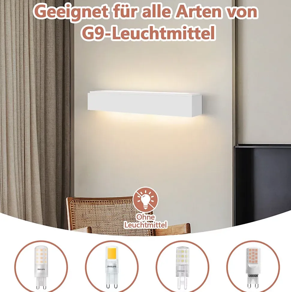 Design moderne : cette applique murale d’intérieur a une forme unique, un savoir-faire exquis rend l’apparence plus à la mode et élégante, en plus de la fonction d’éclairage, elle est également très adaptée à la plupart des styles de décoration intérieureAmpoule G9 remplaçable : convient aux ampoules G9 (non incluses), avec la conception des effets de lumière supérieurs et inférieurs de l’applique murale, vous pouvez choisir la bonne ampoule en fonction des différents besoins d’éclairage et créer un effet d’éclairage mural confortableLarge gamme d’utilisations : le matériau en plâtre qui peut être peint vous permet de bricoler vos lampes préférées pour décorer votre pièce. Cette applique murale moderne est parfaite pour différentes pièces telles que le salon, la chambre, l’escalier, le couloir, le bureau, etc. C’est également un cadeau parfait pour votre famille et vos amisSpécifications du produit : applique murale blanche taille : 52*7,7*8,4 cm, tension 220-240 V, puissance maximale 40 W, non étanche. Fabriqué en plâtre, surface lisse, durable et sans décolorationInstallation facile : Les appliques murales sont fixées au mur, il suffit de suivre nos instructions. Si vous avez des questions sur nos appliques murales d’intérieur, veuillez nous contacter