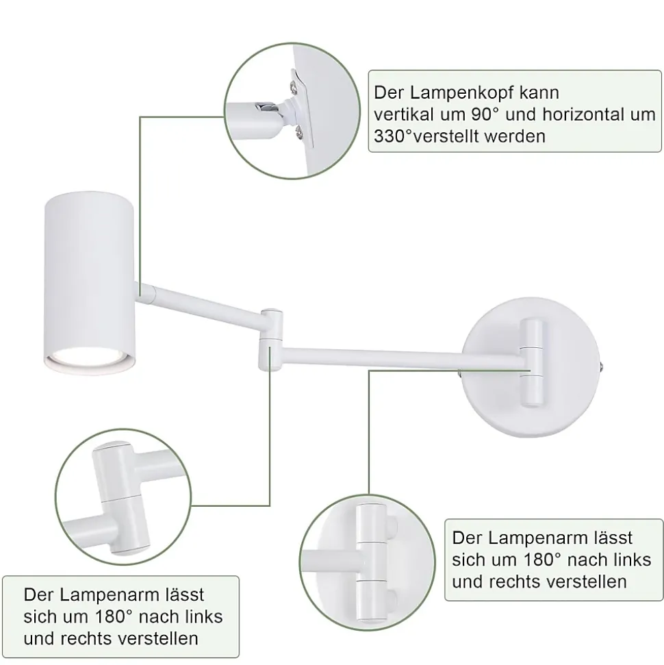 Élégance blanche : La couleur blanche donne à cette applique murale en métal un look vintage élégant, durable et stable. Il s’adapte parfaitement à différents styles d’ameublement et crée une atmosphère lumineuse et conviviale.Caractéristiques du produit : Avec une tension de 230 V et une puissance maximale de 40 W, cette applique offre un éclairage fiable. Étanche. Longueur entièrement déployée : 50 cm.Réglage flexible : la tête de la lampe peut être ajustée verticalement de 90° et horizontalement de 330°, et le bras de la lampe peut être ajusté à gauche et à droite de 180°. Vous pouvez librement ajuster la direction et l’angle de l’applique murale selon vos besoins et projeter la lumière exactement là où vous en avez besoin.Douille GU10 : convient aux lampes GU10, économe en énergie . Vous pouvez choisir la bonne ampoule pour différents besoins d’éclairage (les ampoules ne sont pas incluses dans le colis.LARGE APPLICATION: Il convient à diverses pièces telles que le salon, la chambre, le couloir, la cuisine et le bureau. Cet éclairage mural est également parfait comme cadeau pour la famille et les amis.