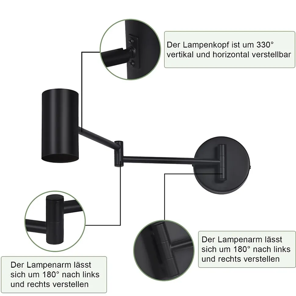 Design vintage : l’applique murale noire vintage en métal incarne le style classique du design rétro et confère à votre pièce un charme et un goût uniques.Réglage flexible : la tête de la lampe peut être réglée verticalement et horizontalement sur 330° et le bras de la lampe peut être réglé à gauche et à droite sur 180°, ce qui vous permet de régler librement la direction et l’angle de la lumière selon vos besoins et d’obtenir l’effet lumineux idéal.Douille GU10 : la douille GU10 vous permet de choisir l’ampoule appropriée en fonction de vos préférences personnelles afin de répondre à différents besoins d’éclairage. (Les ampoules ne sont pas incluses dans le paquet).LARGEMENT APPLICABLE : tension de 230 volts, puissance maximale de 40W, large application, peut être utilisé dans le salon, la chambre à coucher, le bureau et de nombreux autres endroits pour vous offrir un environnement lumineux agréable.Spécification du produit:Le matériau est en métal, couleur : noir, tension : 230V, puissance maximale : 40W. La lampe est livrée dans un emballage de haute qualité et convient également comme cadeau pour votre famille ou vos amis.