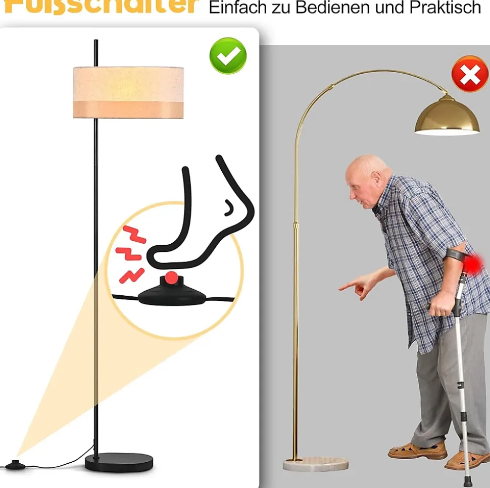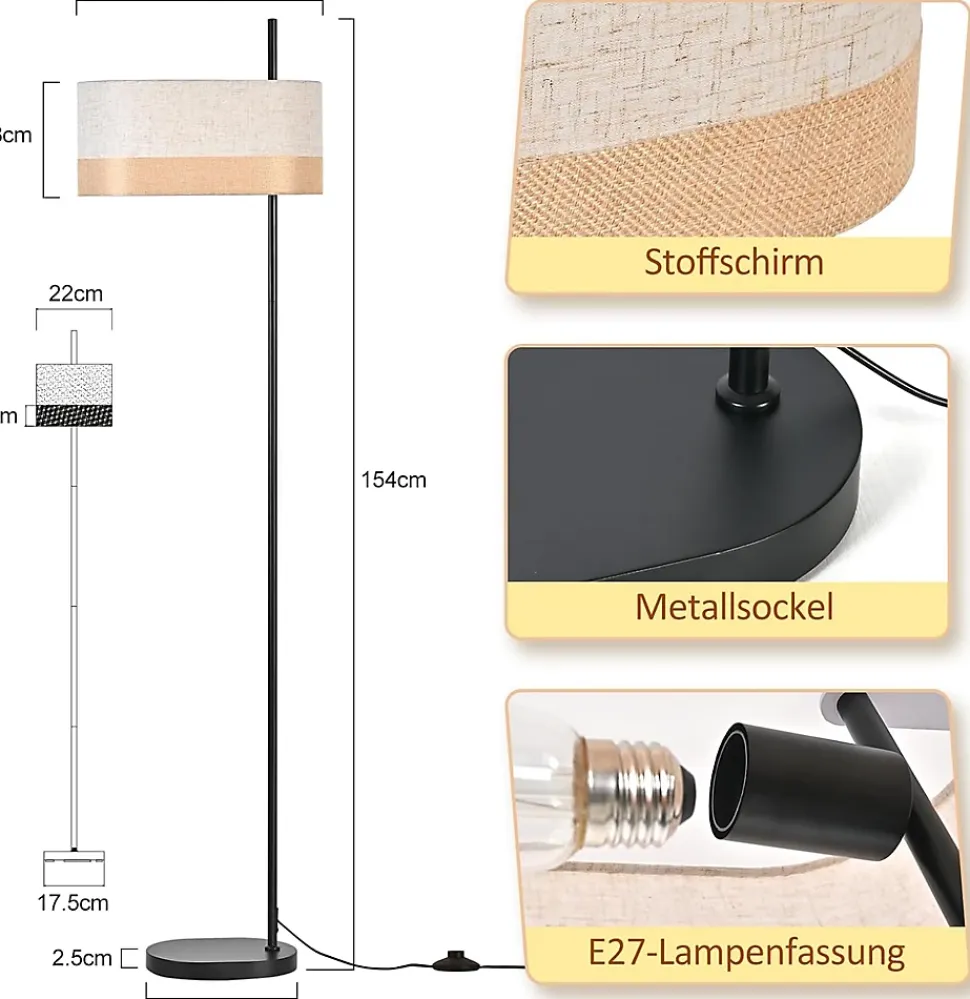Abat-jour en Tissu : L’abat-jour de ce lampadaire Nettlife est fabriqué en tissu de haute qualité (40 cm x 18 cm). Il filtre efficacement l’éblouissement et diffuse une lumière douce et agréable, offrant une excellente expérience de lecture. Le tissu est résistant aux plis, à la chaleur et facile à nettoyer, garantissant une longue durée de vie.Stable et Durable : Le corps principal de la lampe rétro est en fer, résistant à la corrosion. La structure en fer a une bonne capacité de charge et, associée à la base métallique robuste, assure que la lampe reste stable dans divers environnements.Douille Standard E27 : Ce lampadaire de salon rétro est adapté aux ampoules E27 (max. 40W). Vous pouvez choisir la température de couleur et la luminosité selon vos préférences pour répondre aux besoins spécifiques de la pièce. (Ampoule non incluse).Interrupteur à Pied : Le lampadaire en tissu Nettlife dispose d’un interrupteur à pied pratique. D’une simple pression du pied, vous pouvez allumer ou éteindre la lampe sans avoir à vous baisser, ce qui est idéal si vous avez les mains prises ou pour les personnes à mobilité réduite.Utilisation Facile : La lampe de lecture est livrée avec un manuel et tout le matériel d’installation nécessaire. Le montage est rapide et simple. Elle convient parfaitement aux salons, chambres, bureaux, servant aussi bien d’éclairage général que de lampe de lecture.