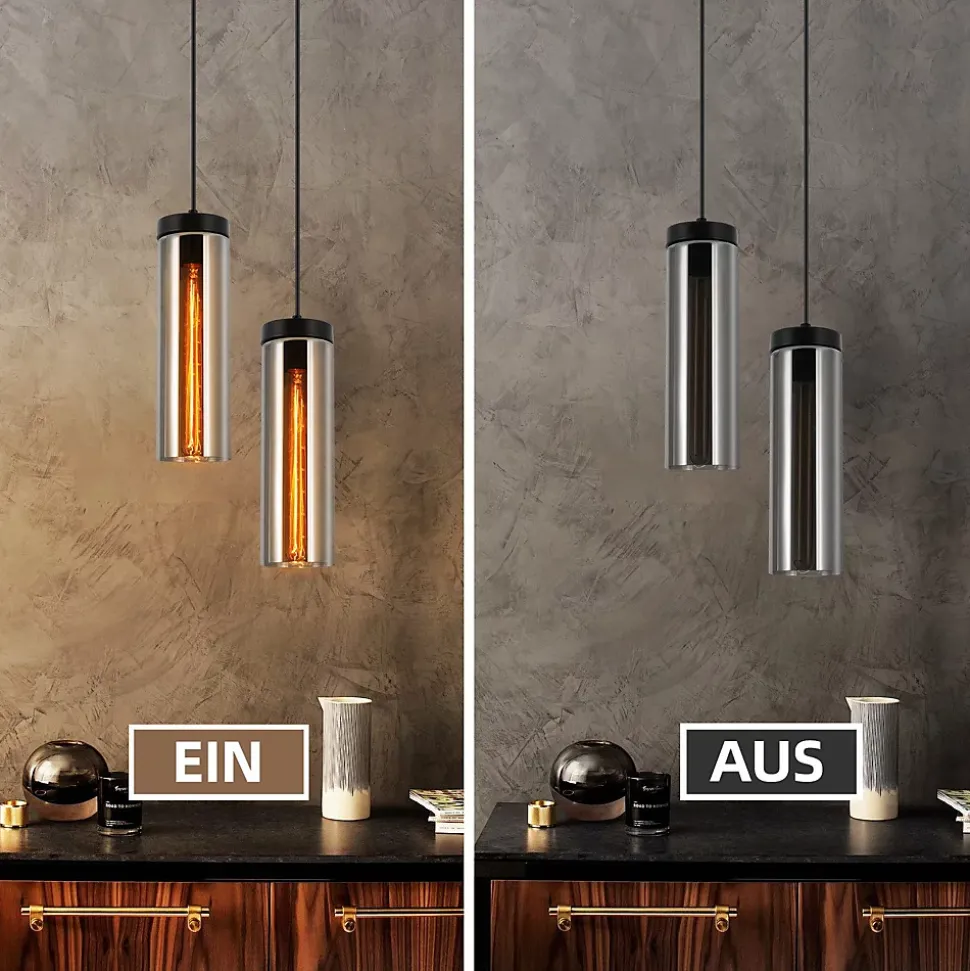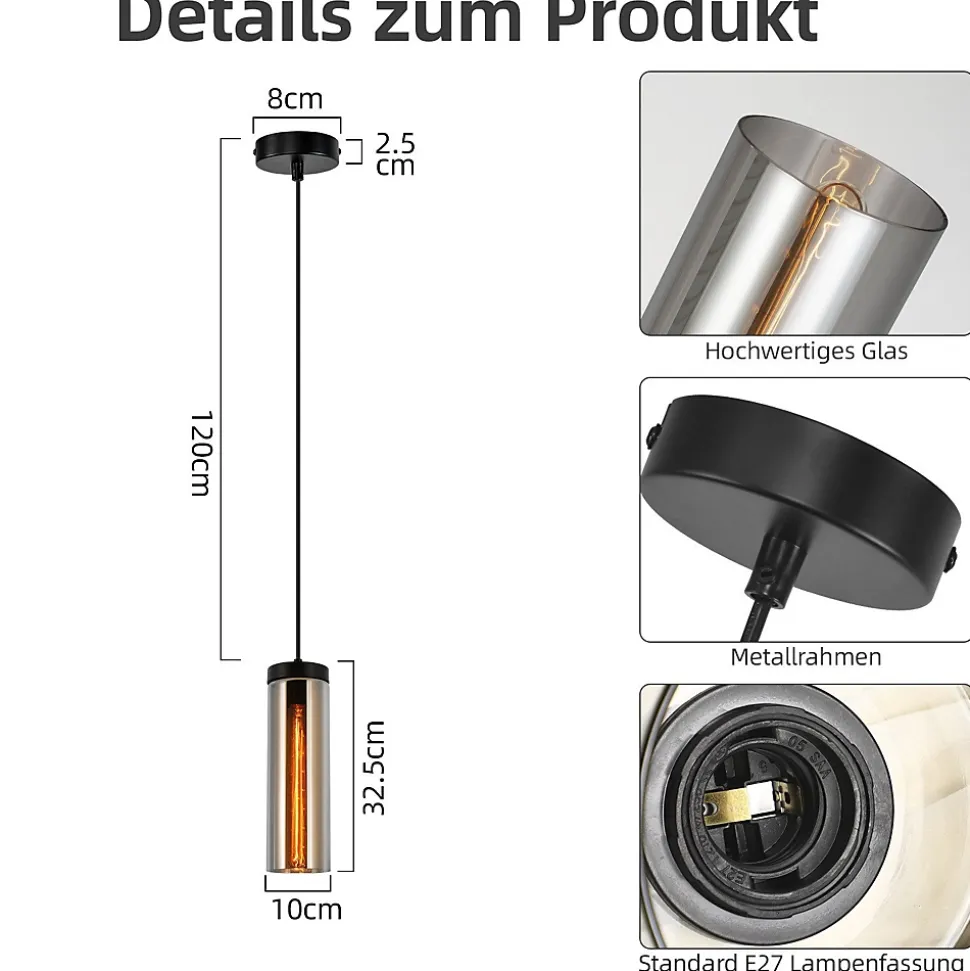caractéristiques de conception la suspension est conçue avec un verre gris fumé, ce qui donne à la source lumineuse un sentiment de présence particulier et peut être combinée avec différents styles de meubles pour compléter harmonieusement l’esthétique de la pièce. En même temps, le verre a une bonne transmission de la lumière, ce qui permet de maximiser la lumière dans la pièce.taille du produitla partie abat-jour de cette suspension de salle à manger taille : 10 * 10 * 32,5 cm ; câble : 120 cm de long, réglable en hauteur ; taille du cadre de la plaque de plafond ronde : 8*8*2,5 cm ; matière : fer/verre.source de lumière remplaçable e27la tête de cette suspension en verre peut être remplacée, peut remplacer de manière flexible la source de lumière de diverses douilles e27, telles que les styles vintage, modernes et autres, répondant pleinement à vos besoins de bricolage. De plus, le plafonnier 1 lumière a une puissance maximale de 40w, une tension d’entrée de 230v et un indice de protection ip20.matériau de haute qualité et facile à installerla suspension est composée d’un cadre en fer robuste et de verre de haute qualité, qui ne rouille pas facilement et présente une transmission lumineuse élevée, garantissant durabilité et sécurité. De plus, la suspension est facile à assembler avec une gamme complète d’accessoires, pas besoin d’outils compliqués ni de compétences professionnelles, vous pouvez terminer l’installation en quelques minutes.large gamme d’utilisationscette suspension de salle à manger présente un design simple et généreux avec une apparence cylindrique minimaliste, qui convient très bien aux îlots de cuisine, tables à manger, salons, chambres, cuisines, couloirs, porches, magasins, hôtels, bars, bureaux et autres espaces événementiels.