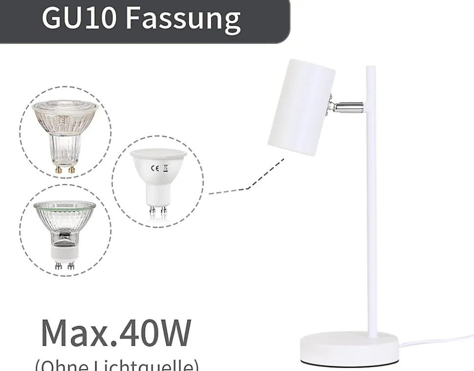 Design artistique : cette lampe de table impressionne par sa finition de haute qualité et son aspect élégant. La couleur noire classique le rend particulièrement élégant et intemporelFlexibilité : cette lampe de table peut s’incliner jusqu’à 90° et pivoter à 350°, vous permettant d’ajuster librement l’angle d’expositionMatériaux de haute qualité : la lampe de table est fabriquée en métal robuste avec un revêtement noir durable, résistant à la corrosion, à la rouille et au pelage.Ampoule GU10 remplaçable : la lampe est disponible sans ampoule pour répondre à vos besoins de bricolage. Remarque : 40 W maximum. Recommandation : longueur de la source lumineuse ≤ 47 mm.Application polyvalente : vous pouvez installer cette lampe de table dans la zone de couchage, le salon, le bureau, le bureau, la cuisine, la salle à manger, le café et d’autres endroits