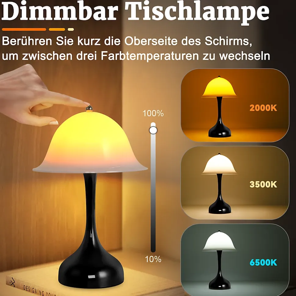 Lampe de Table LED Tactile Rechargeable : Cette lampe de table moderne et sans fil s’allume et s’éteint d’une simple pression sur le bouton rond. Une courte pression permet de régler la température de couleur (2000K, 3500K, 6500K) et une longue pression règle la luminosité de 5 % à 100 %. Cette élégante lampe de chevet LED est dimmable, vous permettant d’ajuster individuellement la lumière. Elle convient également comme veilleuse.Batterie Puissante : La batterie intégrée de 2000 mAh avec une puissance de charge maximale de 3 W se recharge complètement via USB-C en seulement 4 heures et offre jusqu’à 7 heures d’éclairage. Grâce à cette longue autonomie, elle peut servir de lumière d’urgence en cas de panne de courant.Matériaux de Haute Qualité et Design Moderne : Le corps de la lampe est en plastique ABS et son aspect en forme de chapeau apporte une touche élégante à votre pièce. Équipée d’une LED dimmable (2000–6500 K), elle crée une atmosphère chaleureuse avec sa lumière douce.Portable et Sans Fil : Son design classique et élégant en fait le cadeau parfait. Grâce à sa taille compacte, elle trouve sa place même dans les petits espaces. Cette lampe de bureau portable, sans fil et rechargeable est facile à transporter et idéale pour toutes les pièces : chambre, salon, salle à manger ou cuisine.Utilisations Polyvalentes : Cette lampe de chevet convient à divers intérieurs, notamment le salon, le bureau, la chambre, les dortoirs, les hôtels, les tables de chevet, les tables à manger, les cuisines, les balcons, les bibliothèques et bien plus encore.