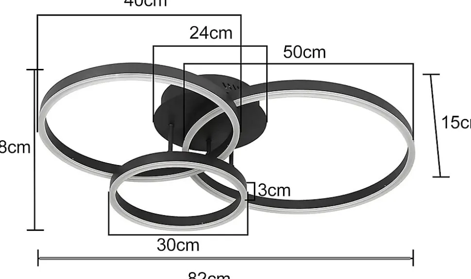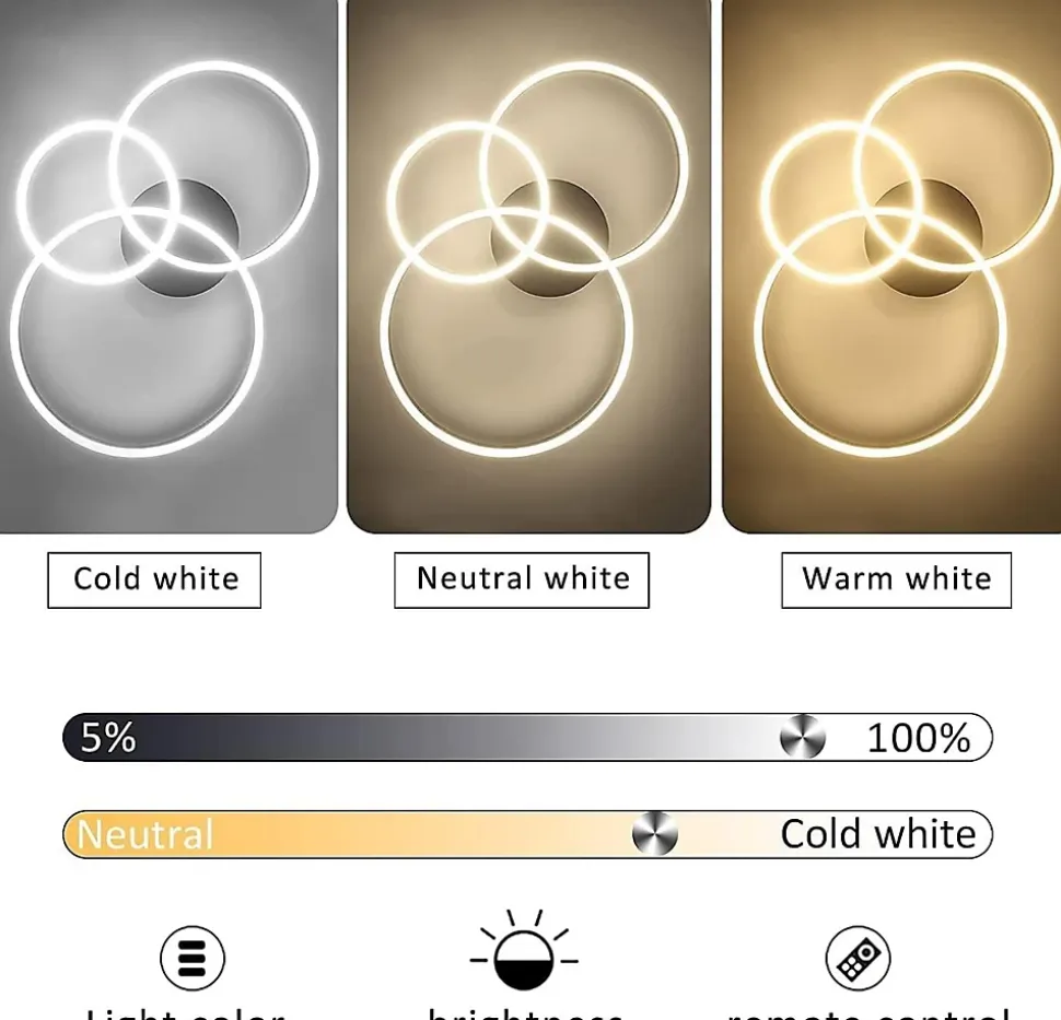 Design moderne et créatif :Découvrez ce plafonnier de salon unique, composé de trois anneaux de tailles différentes en aluminium et acrylique. Cette combinaison offre une excellente luminosité, idéale pour les grandes pièces. Qualité de la lumière à intensité variable :Avec une télécommande, vous pouvez contrôler en continu la luminosité et régler la température de couleur du blanc froid au blanc chaud. Cela vous permet de créer l’ambiance lumineuse exactement selon vos idées. Données techniques :Dimension du produit : environ 825815 cm. Dimensions de la plaque de plafond : environ Ø24*3,6 cm. Consommation électrique : 74 watts. Le beau plafonnier avec son ensemble éclaire de manière optimale chaque pièce. Température de couleur : 3000K-6500K. Type d’ampoule : LED. Lampes installées en permanence : Oui. Alimentation : électrique filaire. Tension : 230 V.Application polyvalente :Idéal pour les salons, les chambres, les salles à manger, les bureaux et les couloirs. Cette lumière est également idéale pour les espaces commerciaux et d’exposition tels que les restaurants, les galeries, les cafés et les halls. Il combine une lumière agréable avec la dernière technologie d’éclairage pour créer une atmosphère lumineuse unique. Garantie fiable :Bénéficiez d’une garantie de 2 ans pour protéger votre investissement et être assuré d’un éclairage durable et fiable.
