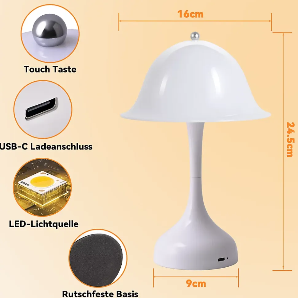 Lampe de Table LED Tactile Rechargeable : Cette lampe de table moderne et sans fil s’allume et s’éteint d’une simple pression sur le bouton rond. Une courte pression permet de régler la température de couleur (2000K, 3500K, 6500K) et une longue pression règle la luminosité de 5 % à 100 %. Cette élégante lampe de chevet LED est dimmable, vous permettant d’ajuster individuellement la lumière. Elle convient également comme veilleuse.Batterie Puissante : La batterie intégrée de 2000 mAh avec une puissance de charge maximale de 3 W se recharge complètement via USB-C en seulement 4 heures et offre jusqu’à 7 heures d’éclairage. Grâce à cette longue autonomie, elle peut servir de lumière d’urgence en cas de panne de courant.Matériaux de Haute Qualité et Design Moderne : Le corps de la lampe est en plastique ABS et son aspect en forme de chapeau apporte une touche élégante à votre pièce. Équipée d’une LED dimmable (2000–6500 K), elle crée une atmosphère chaleureuse avec sa lumière douce.Portable et Sans Fil : Son design classique et élégant en fait le cadeau parfait. Grâce à sa taille compacte, elle trouve sa place même dans les petits espaces. Cette lampe de bureau portable, sans fil et rechargeable est facile à transporter et idéale pour toutes les pièces : chambre, salon, salle à manger ou cuisine.Utilisations Polyvalentes : Cette lampe de chevet convient à divers intérieurs, notamment le salon, le bureau, la chambre, les dortoirs, les hôtels, les tables de chevet, les tables à manger, les cuisines, les balcons, les bibliothèques et bien plus encore.