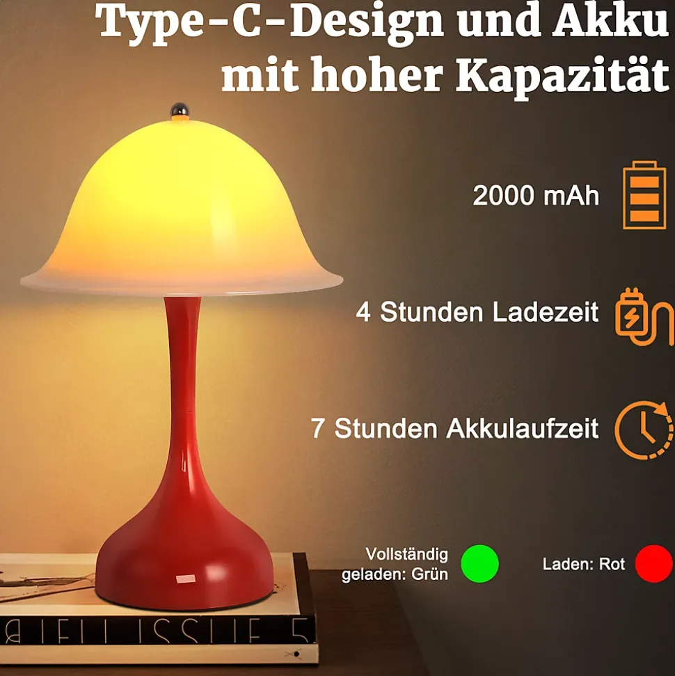 Lampe de Table LED Tactile Rechargeable : Cette lampe de table moderne et sans fil s’allume et s’éteint d’une simple pression sur le bouton rond. Une courte pression permet de régler la température de couleur (2000K, 3500K, 6500K) et une longue pression règle la luminosité de 5 % à 100 %. Cette élégante lampe de chevet LED est dimmable, vous permettant d’ajuster individuellement la lumière. Elle convient également comme veilleuse.Batterie Puissante : La batterie intégrée de 2000 mAh avec une puissance de charge maximale de 3 W se recharge complètement via USB-C en seulement 4 heures et offre jusqu’à 7 heures d’éclairage. Grâce à cette longue autonomie, elle peut servir de lumière d’urgence en cas de panne de courant.Matériaux de Haute Qualité et Design Moderne : Le corps de la lampe est en plastique ABS et son aspect en forme de chapeau apporte une touche élégante à votre pièce. Équipée d’une LED dimmable (2000–6500 K), elle crée une atmosphère chaleureuse avec sa lumière douce.Portable et Sans Fil : Son design classique et élégant en fait le cadeau parfait. Grâce à sa taille compacte, elle trouve sa place même dans les petits espaces. Cette lampe de bureau portable, sans fil et rechargeable est facile à transporter et idéale pour toutes les pièces : chambre, salon, salle à manger ou cuisine.Utilisations Polyvalentes : Cette lampe de chevet convient à divers intérieurs, notamment le salon, le bureau, la chambre, les dortoirs, les hôtels, les tables de chevet, les tables à manger, les cuisines, les balcons, les bibliothèques et bien plus encore.