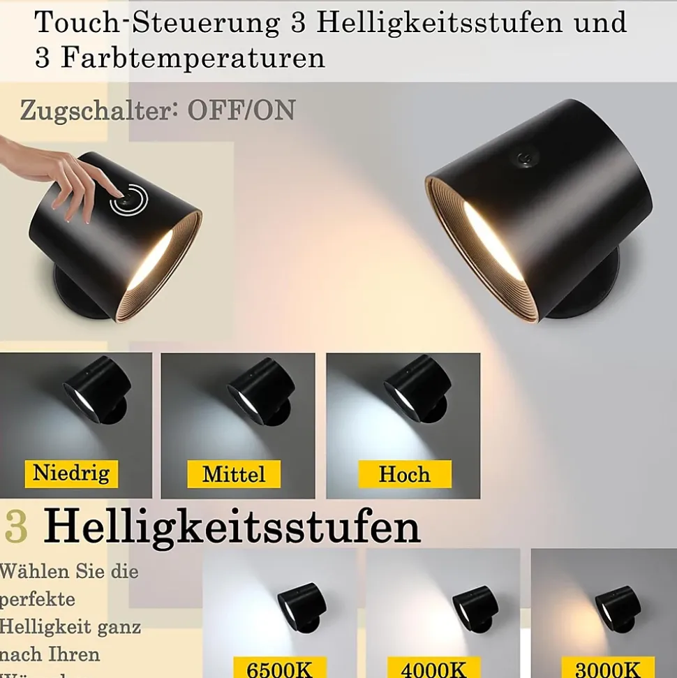 【3 Températures de couleur et Luminosité Réglable】L’applique murale intérieure offre un design tactile avec 3 températures de couleur et une luminosité ajustable de 10% à 100%. Utilisez-la comme applique murale, lampe de chevet ou lampe de lecture. Idéale pour les chambres, salons, couloirs, cages d’escalier, armoires, vitrines, ainsi que pour le travail, la lecture, l’apprentissage, le camping et comme éclairage de secours. La lampe murale noire est le choix parfait pour votre maison.【360° Ajustable】Cette applique murale utilise une technologie magnétique pour fixer le support avec de l’adhésif 3M puissant (kit de vis également disponible). Elle peut être orientée librement à 360° pour une lumière directionnelle. Fabriquée en ABS+PC, elle est sûre, inodore, moderne et portable. Cette applique murale est non seulement fonctionnelle mais aussi une œuvre d’art.【Batterie Intégrée et Charge USB】Équipée d’un connecteur Type-C et d’une batterie de 2000mAh, cette applique murale se charge en 3 à 4 heures. Elle offre une autonomie de 5 heures à pleine luminosité, 8 heures à luminosité moyenne et 20 heures à faible luminosité. Le design LED est simple et à la mode, s’adaptant à la plupart des styles de décoration.【Protection des Yeux】Cette applique murale LED sans fil est équipée de 22 ampoules LED de haute qualité, offrant une lumière uniforme et agréable sans éblouissement ni scintillement. Elle protège vos yeux de la fatigue et convient à une utilisation prolongée. Offrez à vos yeux la protection qu’ils méritent grâce à notre applique murale innovante avec batterie.