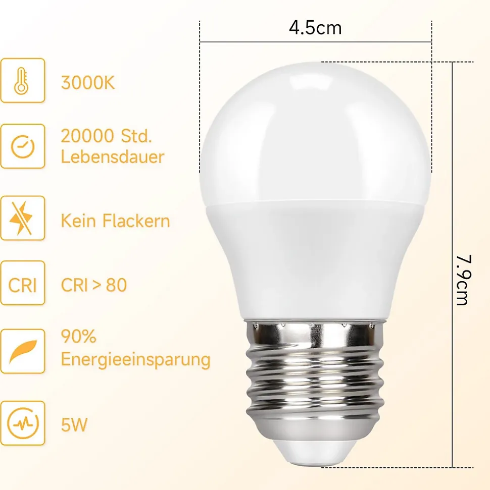 Efficacité énergétique : cette ampoule LED utilise seulement 5 watts de puissance et constitue toujours un remplacement parfait pour les ampoules à incandescence traditionnelles de 50 watts, vous permettant d’économiser jusqu’à 90 % sur votre facture d’électricité.Effet d’éclairage chaleureux : Il illumine immédiatement la pièce d’une lumière chaude et agréable et donne à votre salon une atmosphère cosy sans problème stroboscopiquedurable : la technologie avancée de puce LED garantit une longue durée de vie allant jusqu’à 20 000 heures, ce qui réduit considérablement la fréquence de remplacement et économise plus de ressources. Chaque assemblage comprend 6 ampoules LED E14 avec base en métal chromé pour garantir une durabilité stableExcellentes performances : la source lumineuse est conforme aux normes européennes de tension AC 230 V et a une température de couleur de 2 700 K. Il est stable et possède un indice de rendu des couleurs supérieur à 80, très proche de la lumière naturelle et protège les yeux de l’utilisateur.Service client : si vous rencontrez des problèmes lors du processus d’utilisation, n’hésitez pas à contacter notre équipe de service client professionnel, nous serons heureux de vous aider à le résoudre.