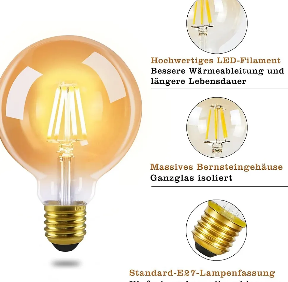 ÉCONOMIE D’ÉNERGIE: Cette ampoule vintage Edison e27 a un effet économe en énergie, remplace la lampe à incandescence conventionnelle de 40 W, ce qui permet d’économiser jusqu’à 90 % par rapport aux ampoules classiques ; Avec des filaments LED de haute qualité, la source lumineuse est constante et ne scintille pas.Cette ampoule rétro Edison est une lumière blanche chaude décorative de 2700K, les ampoules sont sphériques avec un diamètre moyen de 80 mm. Lumière douce et chaude, inoffensive pour la peau et les yeux, a un effet romantique, crée une lumière agréable et une atmosphère chaleureuse.Beau design en verre : le corps en verre est en verre, très résistant aux rayures. Les ampoules à filament LED rétro sont beaucoup plus chaudes, l’ampoule en verre elle-même a une belle couleur, donnant à toute l’atmosphère un aspect rétro et nostalgique.UNIVERSEL: Ils ont fière allure avec un support de lampe et une corde ou un long câble, et peuvent également être facilement installés dans des suspensions, des appliques murales, des suspensions, des plafonniers, des lampes de table, etc. Convient à votre maison, salle à manger, salon la salle, le café, le bar, le musée, les pavillons d’art et les magasins, etc., créent une atmosphère très agréable.SERVICE CLIENT : les ampoules LED sont protégées avec 2 ans de garantie de qualité sans souci, profitez d’un éclairage LED de haute qualité. Nous souhaitons offrir à nos clients une expérience d’achat de haute qualité. En cas de problème avec le produit, veuillez nous contacter. nous à temps, nous vous ferons une offre de solution satisfaisante. Si vous recevez le produit et rencontrez des problèmes, veuillez contacter notre service client.