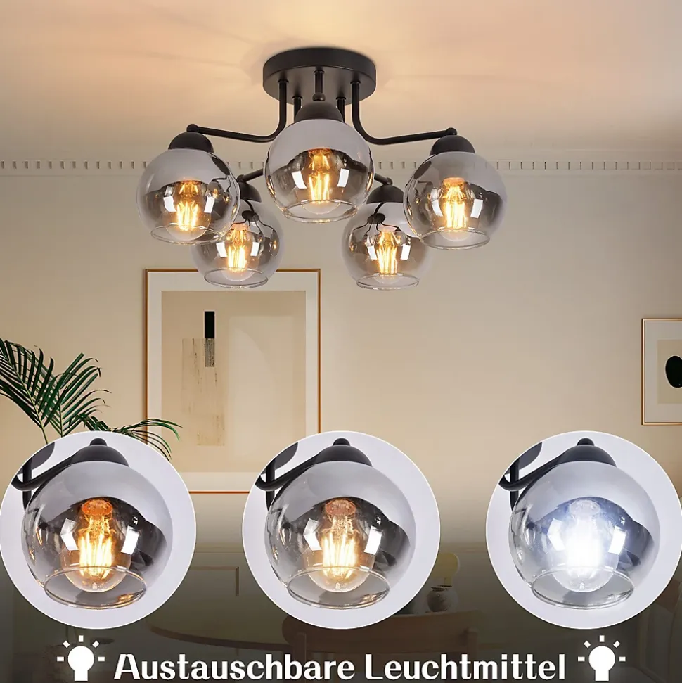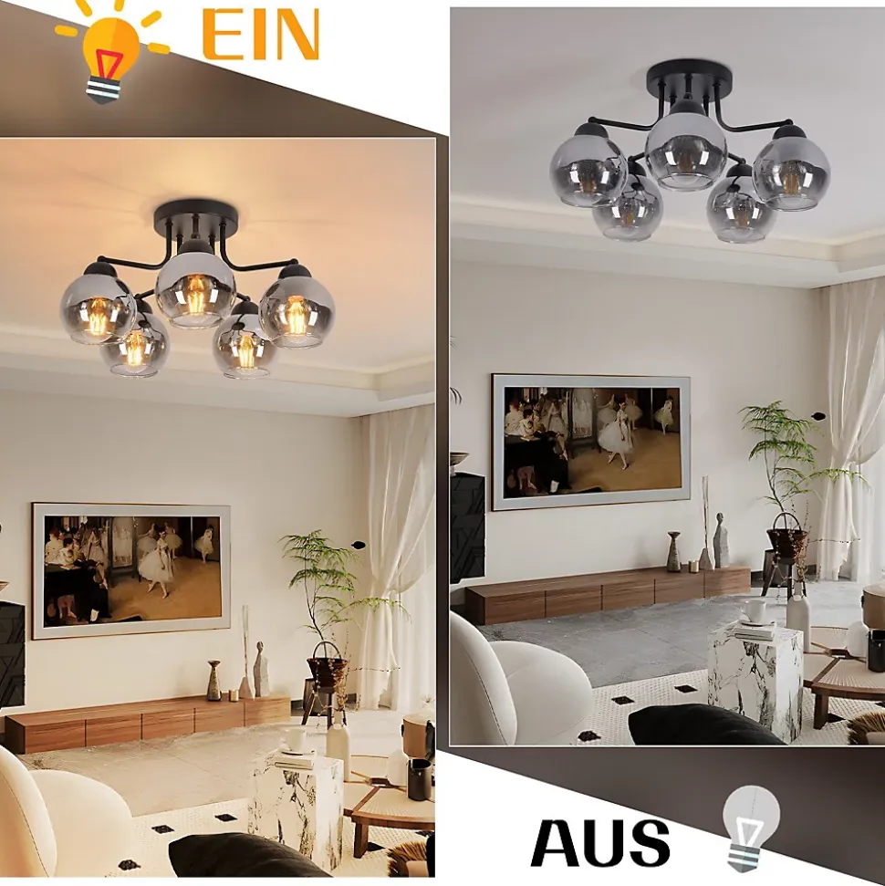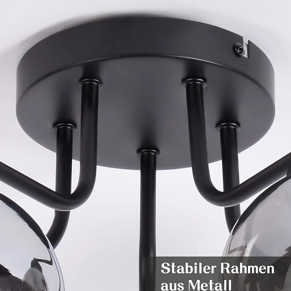 Verre naturel : Ce plafonnier est d’une beauté époustouflante ! L’effet verre fumé confère à la lampe un aspect mystérieux et atmosphérique. C’est un produit naturel, durable et facile d’entretien grâce à sa composition. Grâce à son verre transparent, ce plafonnier apporte une touche chaleureuse à votre intérieur. Installation facile grâce à une tension d’alimentation uniforme : Grâce à la tension d’alimentation uniforme de 230 volts, l’installation du plafonnier est particulièrement pratique. Veuillez noter qu’une prise secteur n’est pas incluse et que l’installation doit donc être effectuée par un professionnel. Caractéristiques du produit : Ce luminaire de salon a un diamètre de 35 cm et une hauteur de 25,6 cm. La plaque de montage a un diamètre de 13 cm et une hauteur de 2,5 cm. Vous pouvez équiper le plafonnier de trois sources lumineuses, chacune équipée d’une douille E27 (max. 25 W) (ampoules non incluses). Les abat-jour en verre ont chacun un diamètre de 10 cm et une hauteur de 9 cm. Du classique au futuriste : Ce plafonnier est fabriqué en métal et en verre et se décline dans un noir élégant. Cette combinaison est absolument intemporelle ! Les plafonniers en verre peuvent varier du classique au plus extravagant, du sobre et simple au futuriste. Quoi qu’il en soit, les plafonniers en verre ont en commun de diffuser magnifiquement la lumière et d’afficher un style toujours élégant et contemporain. ADAPTÉ À TOUS LES INTÉRIEURS : Ce plafonnier boule en verre vintage est l’éclairage idéal pour toutes les pièces. Que ce soit dans la salle à manger, le salon, la cuisine ou la chambre, il apportera une touche glamour vintage unique à votre espace. Avec son délicat abat-jour boule en verre et son design élégant, il allie à merveille modernité et vintage.
