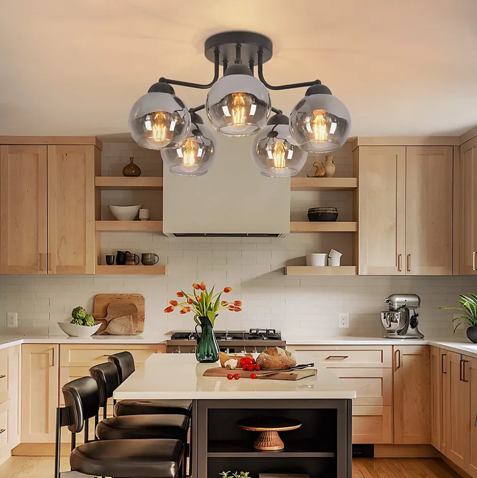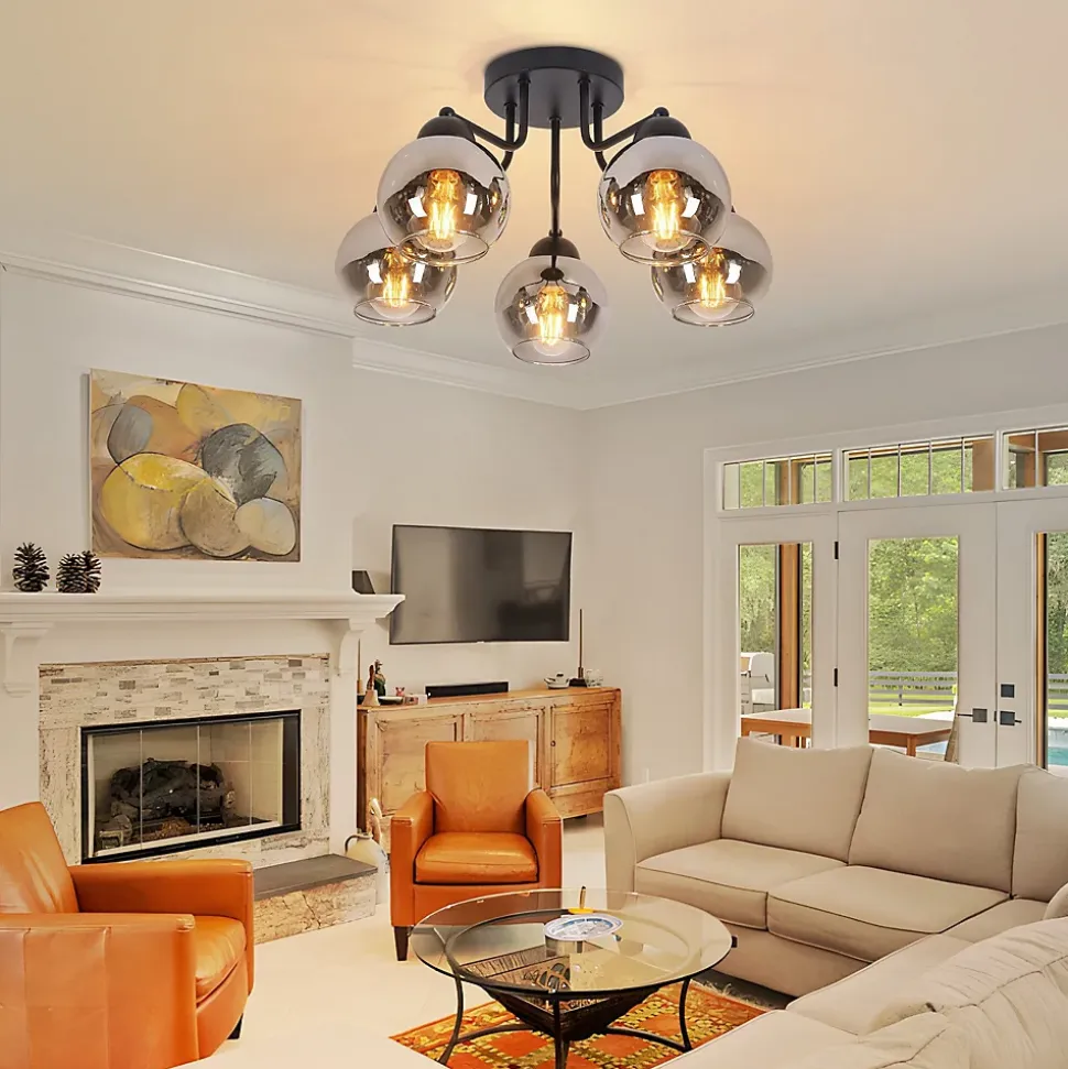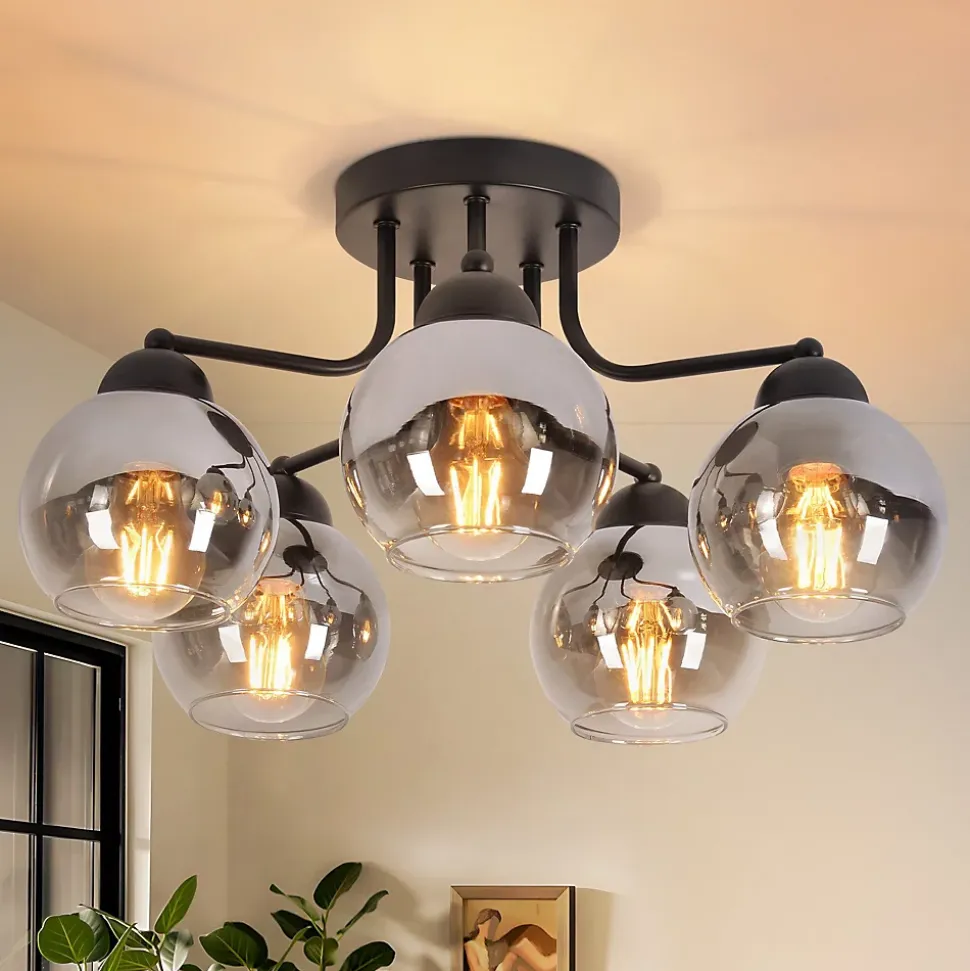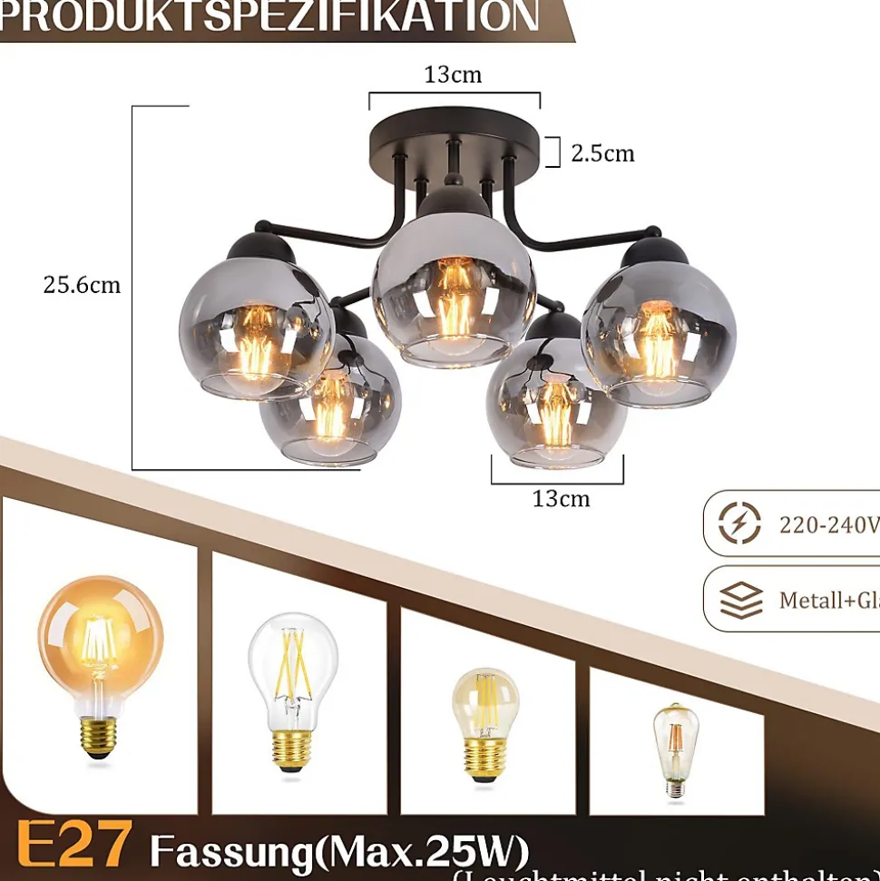 Verre naturel : Ce plafonnier est d’une beauté époustouflante ! L’effet verre fumé confère à la lampe un aspect mystérieux et atmosphérique. C’est un produit naturel, durable et facile d’entretien grâce à sa composition. Grâce à son verre transparent, ce plafonnier apporte une touche chaleureuse à votre intérieur. Installation facile grâce à une tension d’alimentation uniforme : Grâce à la tension d’alimentation uniforme de 230 volts, l’installation du plafonnier est particulièrement pratique. Veuillez noter qu’une prise secteur n’est pas incluse et que l’installation doit donc être effectuée par un professionnel. Caractéristiques du produit : Ce luminaire de salon a un diamètre de 35 cm et une hauteur de 25,6 cm. La plaque de montage a un diamètre de 13 cm et une hauteur de 2,5 cm. Vous pouvez équiper le plafonnier de trois sources lumineuses, chacune équipée d’une douille E27 (max. 25 W) (ampoules non incluses). Les abat-jour en verre ont chacun un diamètre de 10 cm et une hauteur de 9 cm. Du classique au futuriste : Ce plafonnier est fabriqué en métal et en verre et se décline dans un noir élégant. Cette combinaison est absolument intemporelle ! Les plafonniers en verre peuvent varier du classique au plus extravagant, du sobre et simple au futuriste. Quoi qu’il en soit, les plafonniers en verre ont en commun de diffuser magnifiquement la lumière et d’afficher un style toujours élégant et contemporain. ADAPTÉ À TOUS LES INTÉRIEURS : Ce plafonnier boule en verre vintage est l’éclairage idéal pour toutes les pièces. Que ce soit dans la salle à manger, le salon, la cuisine ou la chambre, il apportera une touche glamour vintage unique à votre espace. Avec son délicat abat-jour boule en verre et son design élégant, il allie à merveille modernité et vintage.