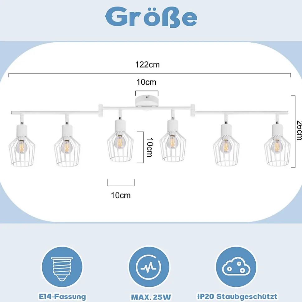Design vintage : le plafonnier blanc est fabriqué en métal de haute qualité avec un excellent matériau et un design simple. Le fond se compose d’une base ronde et d’un cylindre blanc mat, adapté à la plupart des aménagements intérieurs.Flexibilité de la maison : la tête de rail peut être ajustée librement. La plage de rotation du spot de plafond à 6 ampoules est de 90° à 350°, vous pouvez régler librement la lumière et l’angle selon vos besoins pour éclairer différentes zones et obtenir un bon effet visuel.【Multifonctionnalité】 Le spot de plafond LED blanc convient aux couloirs, couloirs, chambres à coucher, buanderies, cuisines, bureaux, balcons et bien d’autres occasions. Il peut être monté au plafond et au mur et peut être utilisé comme applique murale, plafonnier et autres applications d’éclairage.【Ampoule non incluse】 Le plafonnier de salle de bain peut être remplacé de manière flexible par différentes sources de lumière E14, la puissance de sortie maximale est de 25 W. Vous pouvez choisir une tête de lampe blanc chaud, blanc froid ou RVB E14 selon vos besoins.【Installation facile】 Fixez le support au plafond ou au mur et installez l’ampoule E14, l’ampoule sur le support, avec les instructions d’installation et d’accessoires, vous pouvez vérifier les détails d’installation spécifiques de celle-ci.