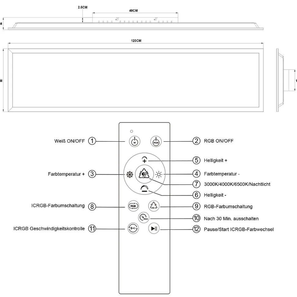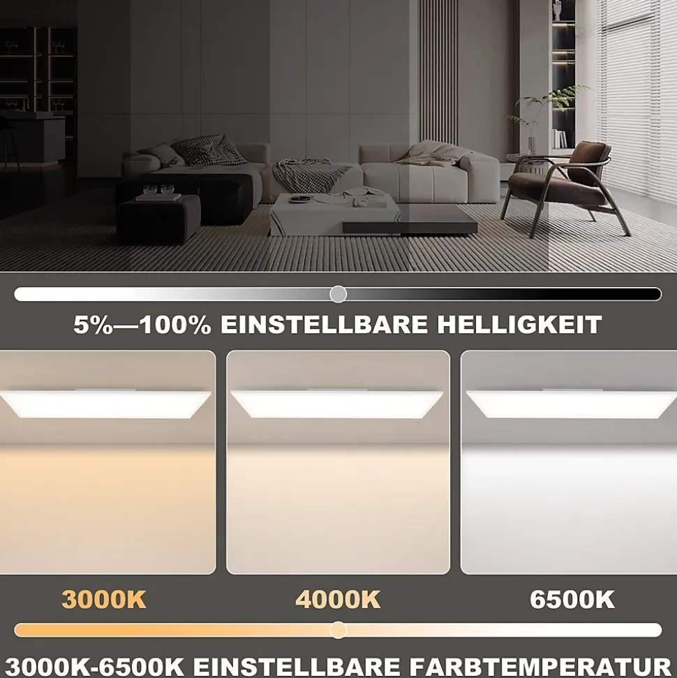 Changement de couleur RVB : Le panneau de plafond rectangulaire permet une large gamme de changements de couleur. Les perles de lampe RVB prennent en charge le mélange des couleurs primaires rouge, vert et bleu et peuvent créer des dégradés plus doux, des mouvements arc-en-ciel et des effets lumineux, ce qui améliore la diversité et les détails de l’éclairageMode veilleuse et fonction minuterie de 30 minutes : ce plafonnier dispose d’un mode veilleuse qui fournit une lumière douce qui n’est pas éblouissante et facilite l’endormissement. La minuterie de 30 minutes éteint automatiquement la lumière après le temps défini. La télécommande vous permet de régler facilement la luminosité et le temps pour garantir une expérience d’éclairage confortable et intelligente. Il convient aux enfants, aux personnes âgées et aux femmes enceintesSans scintillement / Indice de rendu des couleurs élevé / Économie d’énergie : la lampe de bureau utilise une technologie de source lumineuse avancée, qui réduit efficacement le scintillement et évite la fatigue oculaire. Un IRC de 80+ garantit que la source lumineuse peut reproduire avec précision les couleurs réelles des objets et améliore l’expérience visuelle. Il est plus efficace que les ampoules à incandescence traditionnelles et équivaut à une ampoule à incandescence de 200 watts, tout en réduisant la consommation d’énergie et en fournissant une lumière plus viveContrôle de la température de couleur et de la gradation : le panneau LED prend en charge la gradation, la température de couleur peut être réglée entre 3000 K et 6500 K. La luminosité peut être réglée de 5% à 100%. Grâce à la fonction mémoire, le dernier mode de commutation est automatiquement enregistré. En même temps, la température de couleur peut être rapidement commutée via l’interrupteur muralConseils d’installation : En raison de la grande taille du produit, l’installation peut être un peu difficile.