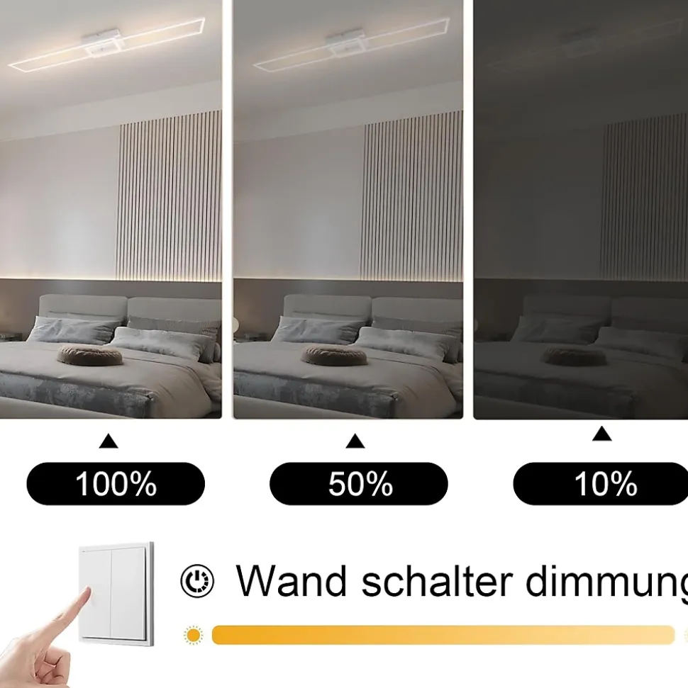Design moderneCe plafonnier LED rectangulaire double dispose d’un cadre extérieur pivotant et d’une barre lumineuse pour une couverture lumineuse optimale et un design moderne.Réglage multifonctionnelLa luminosité est réglable de 10% à 100% via l’interrupteur mural. La température de couleur est fixée à 3000 K. Le plafonnier dispose d’une fonction mémoire pour restaurer le dernier réglage (télécommande non incluse).Matériaux sélectionnésFabriqué à partir de matériaux métalliques durables et élégants, ce plafonnier offre une bonne dissipation thermique. Les puces LED garantissent une transparence élevée, un rendu des couleurs précis, sans éblouissement ni scintillement pour protéger votre vue.Dimensions et spécificationsTaille : 102,5 x 18,5 x 7,3 cmPuissance : 32 WTension : 220-240 VIndice de rendu des couleurs : 80+Installation facileLe produit est livré avec toutes les pièces et instructions nécessaires pour une installation simple dans divers scénarios (salon, chambre, cuisine, salle à manger, bureau, etc.).Mode d’emploi de l’interrupteur muralAllumer la lumière.Réglage de la luminosité : après 10 secondes, choisir une luminosité préférée.Éteindre pendant 1 seconde puis rallumer pour fixer la luminosité.Changer la température de couleur : allumer pendant 1 seconde, éteindre puis répéter le processus pour choisir une nouvelle luminosité.Fixer la température de couleur : après avoir choisi une luminosité préférée, éteindre pendant 1 seconde puis rallumer.