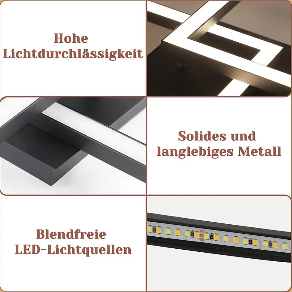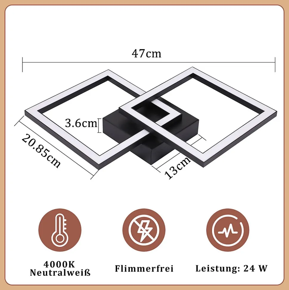 conception rotative : le plafonnier led décoratif est en métal et possède deux éléments lumineux carrés et des couvercles led en aluminium. L’un des éléments lumineux led carrés est réglable et permet une personnalisation individuelle de l’apparence. Vous pouvez ajuster librement l’angle selon vos goûts personnelsprotection des yeux : ce plafonnier moderne consomme 85 % d’énergie en moins par rapport aux ampoules classiques et a une durée de vie allant jusqu’à 20 000 heures. Le plafonnier est doté de sources lumineuses led stables et non éblouissantes qui assurent la protection de vos yeux et créent une atmosphère chaleureuse dans votre pièceparamètres du plafonnier : dimensions : 47 x 29,5 x 6 cm ; tension : 230 v, puissance : 24 w ; dimmable : non ; température de couleur : 4000k-blanc neutre ; indice de protection : ip20, longueur du côté du carré : 21 cm, longueur du côté du plateau de montage au plafond : 13 cm. Le design géométrique offre non seulement un effet visuel chaleureux, mais aussi de la luminosité, de l’éclairage et de la décoration de votre intérieurapplication multi-scénarios : ce plafonnier led noir moderne présente une apparence petite et exquise et convient comme lampe de cuisine, lampe de salle à manger, lampe de couloir, etc. Il est idéal pour les pièces de 5 à 20 mètres carrés, telles que les couloirs, les salons, les salles à manger, les chambres, les cuisines, etc.installation facile : le plafonnier led a un design simple et peut être installé en quelques étapes seulement en connectant le câble et en vissant la lampe au plafond. Si vous avez des questions ou des problèmes, veuillez nous contacter. Nous essaierons de trouver une solution pour vous dans les plus brefs délais
