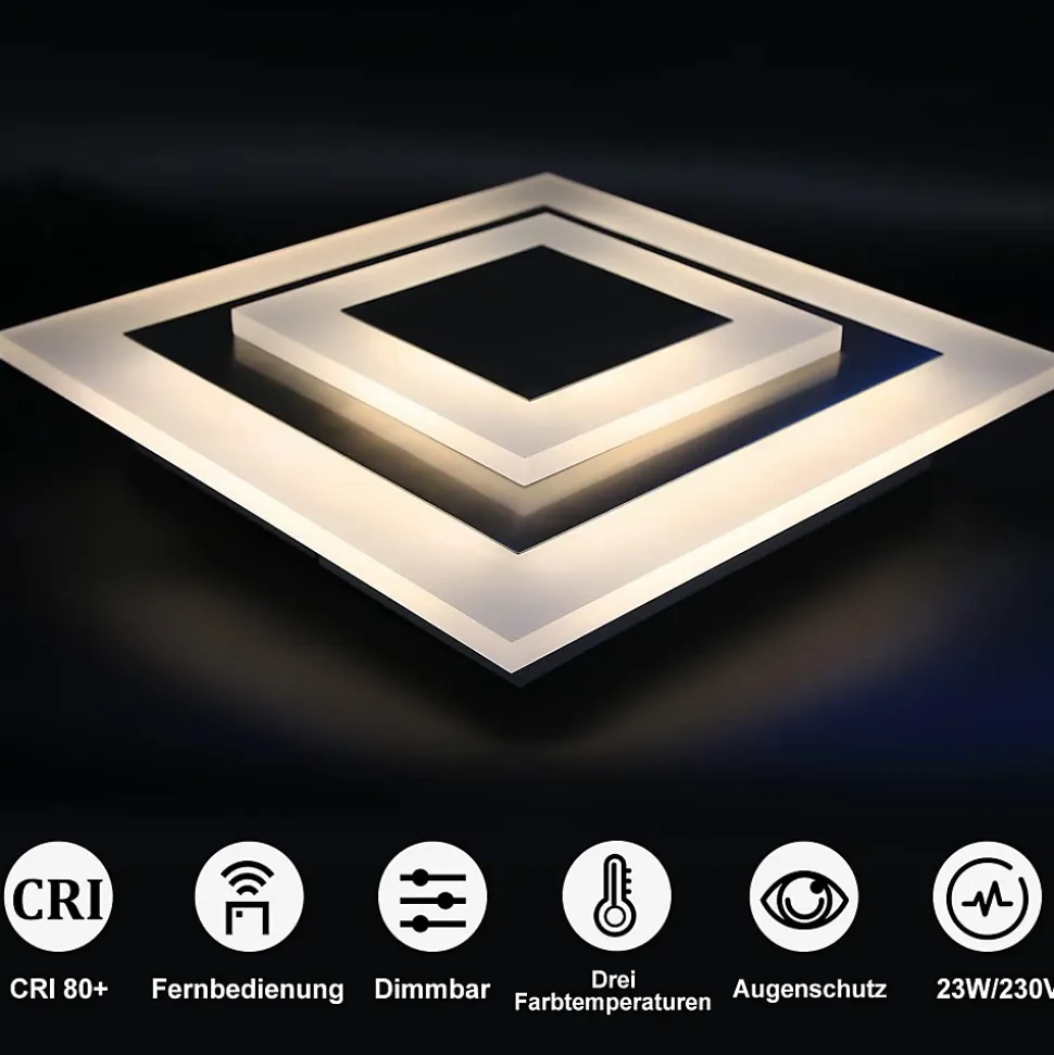 Plafonnier plein de sens du design : ce plafonnier d’une longueur, d’une largeur et d’une hauteur de 30 x 30 x 6 cm est fabriqué à partir de matériaux en fer et en acrylique de haute qualité, a une excellente fonctionnalité et esthétique et donne aux gens un aspect très moderne et de haute qualité. et impression artistique.Plafonnier à intensité variable : via la télécommande, vous pouvez régler le plafonnier LED à différents niveaux de luminosité et températures de couleur. La lumière peut être réglée en blanc chaud, blanc neutre et blanc froid (3 000 K – 6 000 K), créant ainsi différentes ambiances de vie.Large gamme d’applications : ce plafonnier LED est un éclairage intérieur idéal pour protéger vos yeux et votre famille de l’éblouissement. Idéal pour les salles à manger, les meubles, les lofts, les salons, les chambres, les salons, les greniers, les patios, les cafés, les bars, les salles d’étude et autres espaces intérieurs.Spécifications du produit : Taille : 30 x 30 x 6 cm. Puissance : 23W. Lumens : env. 1840 ml. Température de couleur : 3000 K-6500 K. Type d’ampoule : LED. Tension : 230 V. Intensité variable : Oui Indice de rendu des couleurs (CRI) : 80+.Nos plafonniers de salon bénéficient d’une garantie d’achat de 24 mois. Si vous recevez un plafonnier défectueux ou rencontrez des problèmes avec votre lampe de salon lors de son utilisation, n’hésitez pas à nous contacter.Le produit a été récemment révisé et modernisé, et il existe des cas où les scores d’efficacité énergétique ne correspondent pas à la page de détail. Si vous recevez le produit et rencontrez des problèmes, veuillez contacter notre service client.