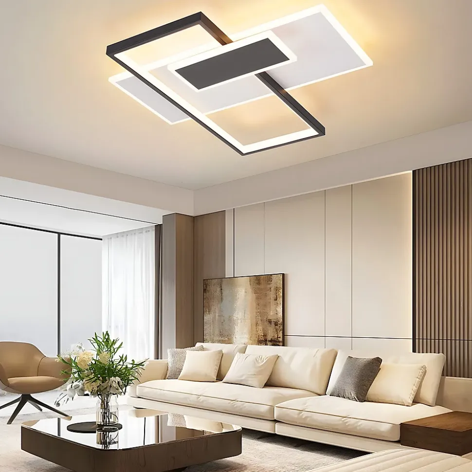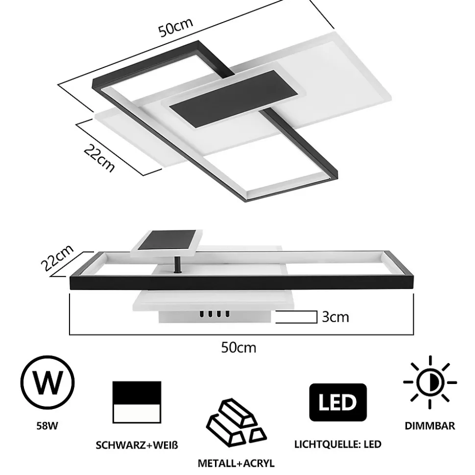 Design moderne : ce plafonnier se compose de deux carrés noirs et blancs décalés, associés à deux spots, le tout en métal et acrylique de haute qualité, pour une apparence élégante et intemporelle.Intensité variable : choisissez entre blanc chaud, blanc neutre et blanc froid pour moduler la couleur de la lumière selon vos préférences et les exigences de chaque pièce.Télécommande : ajustez l’éclairage à votre guise grâce à la télécommande : d’une lumière chaude pour une ambiance chaleureuse à une lumière froide pour une ambiance sophistiquée, parfois plus claire ou plus sombre.Éclairage haute performance : avec une luminosité totale de 5 300 lumens (55 W pour le plafonnier et 7 W pour les spots), ce modèle offre un éclairage suffisant pour chaque pièce.Montage et manipulation faciles : avec une taille de lampe de 50 x 50 x 13 cm, un emballage de 44,5 x 44,5 x 9 cm et un poids de 3,3 kg, ce plafonnier est facile à monter et à transporter sans compromettre la qualité.