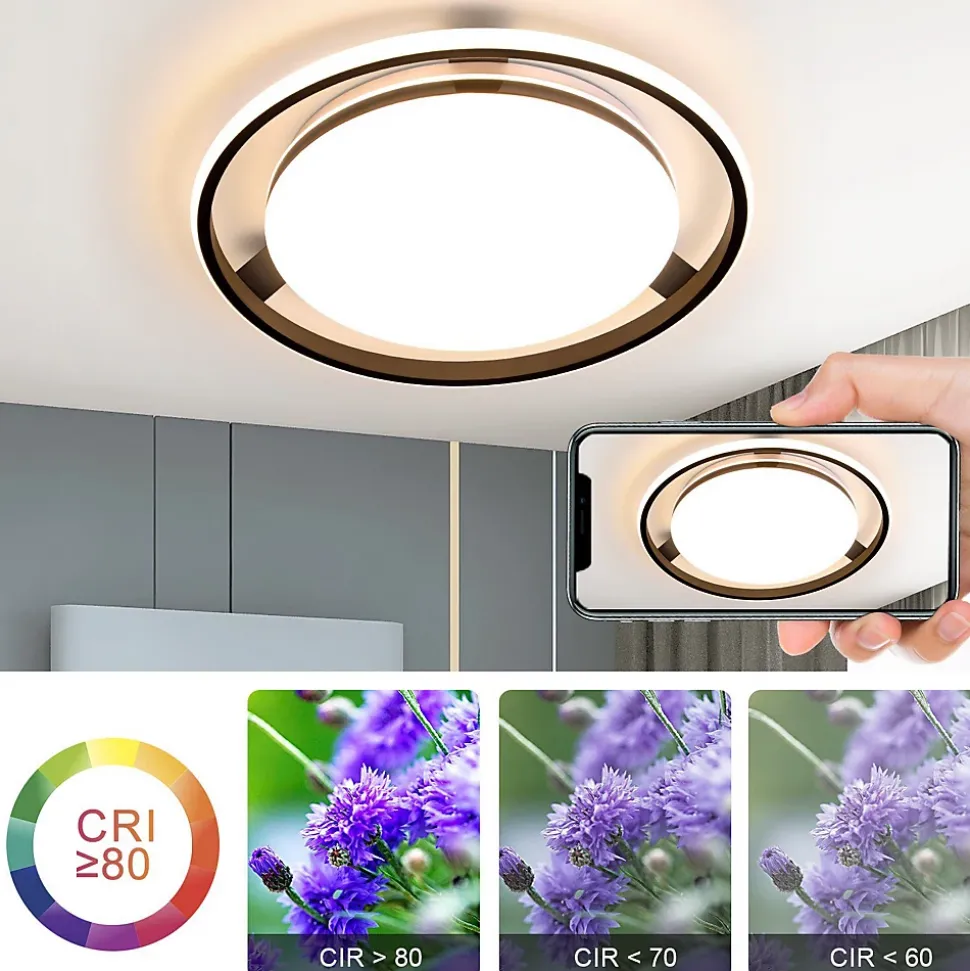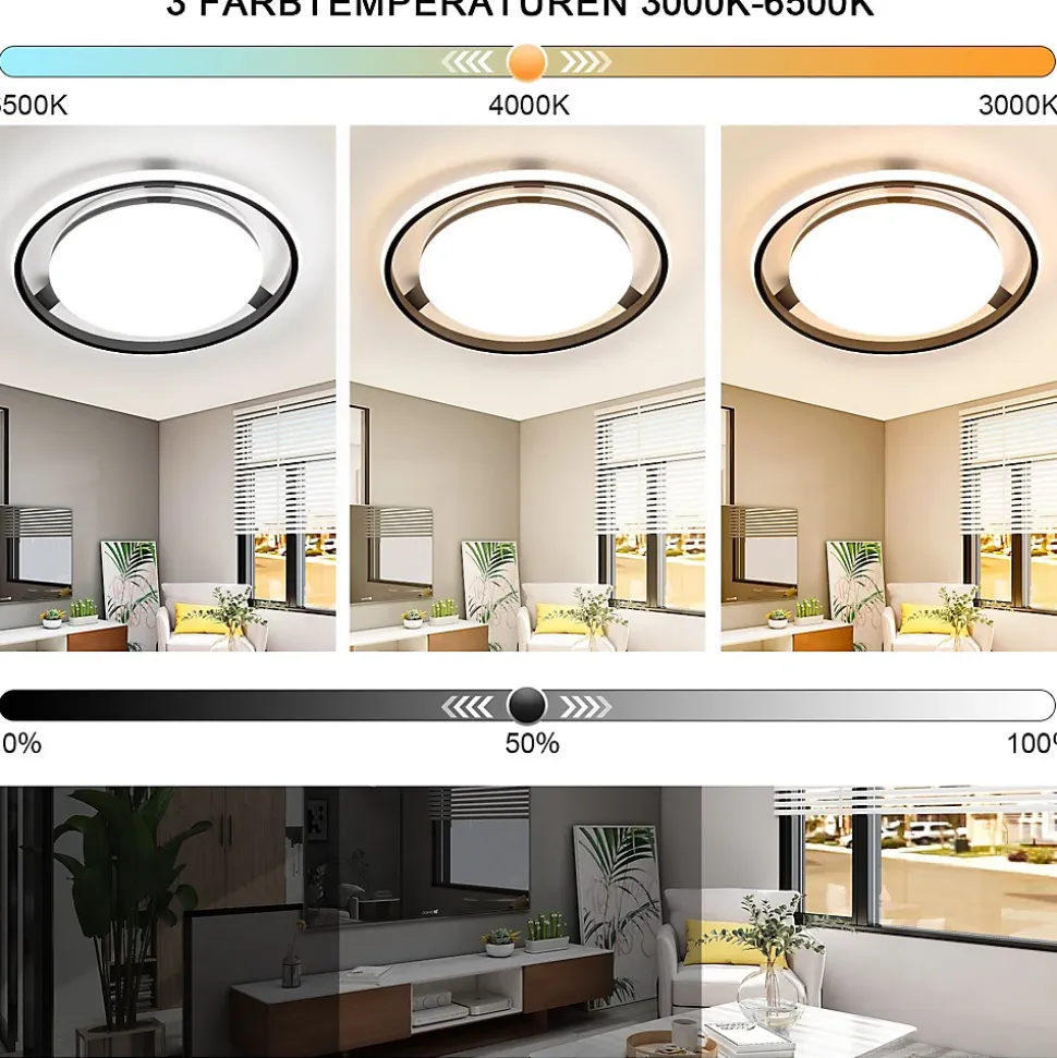 Design semblable à un volant : le design du plafonnier vient du volant, la forme ronde semble simple et directe, le design inhabituel ajoute une touche de classe à votre maison, le design simple et généreux est parfait pour les meubles et la décoration de style scandinave .Arrêt différé + veilleuse : ce plafonnier peut être arrêté avec la télécommande. Dès que vous appuyez sur la touche d’extinction différée de la télécommande, le plafonnier s’éteint au bout de 60 secondes. Lorsque vous appuyez sur le bouton mode veilleuse, le plafonnier fonctionnera avec une faible consommation d’énergie, ce qui est pratique pour les personnes qui aiment dormir ou se lever la nuit avec les lumières allumées.Intensité variable : avec la télécommande pratique, vous pouvez régler l’éclairage selon vos souhaits (3000 K – 6500 K) et régler la luminosité (10 % – 100 %) du plafonnier. Ce plafonnier vous offre non seulement une lumière vive et agréable, mais aussi une décoration élégante pour n’importe quelle pièce.Économie d’énergie + sécurité : le plafonnier utilise une source de lumière LED qui offre les avantages de l’économie d’énergie et de la protection de l’environnement. Par rapport aux ampoules classiques, elle permet d’économiser sur les factures d’énergie et d’électricité. De plus, la source de lumière LED utilisée dans le plafonnier génère très peu de chaleur et ne génère pas de températures élevées comme les ampoules classiques, réduisant ainsi le risque d’incendie.Détails : Dimensions : 44,5 x 44,5 x 5,5 ; Tension 220-240 V ; Puissance : 42 W ; Tension : 230 V ; Intensité variable : oui ; Avec télécommande : Oui. Couleur : noir ; température de couleur : 3 000 K-6 500 K. Le plafonnier convient à diverses occasions, y compris la chambre, le salon, la salle à manger, le bureau, etc., et offre une atmosphère et des effets d’éclairage uniques pour différentes occasions. GARANTIE : 2 ans.