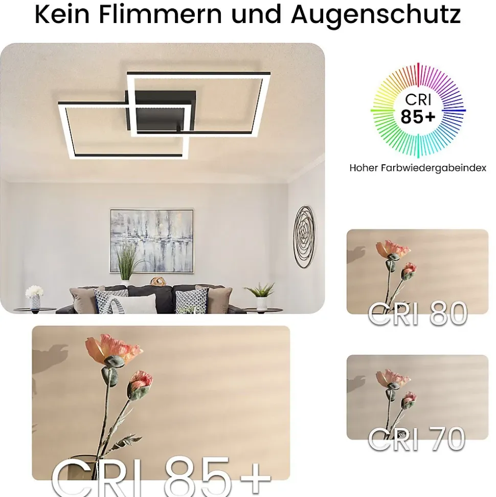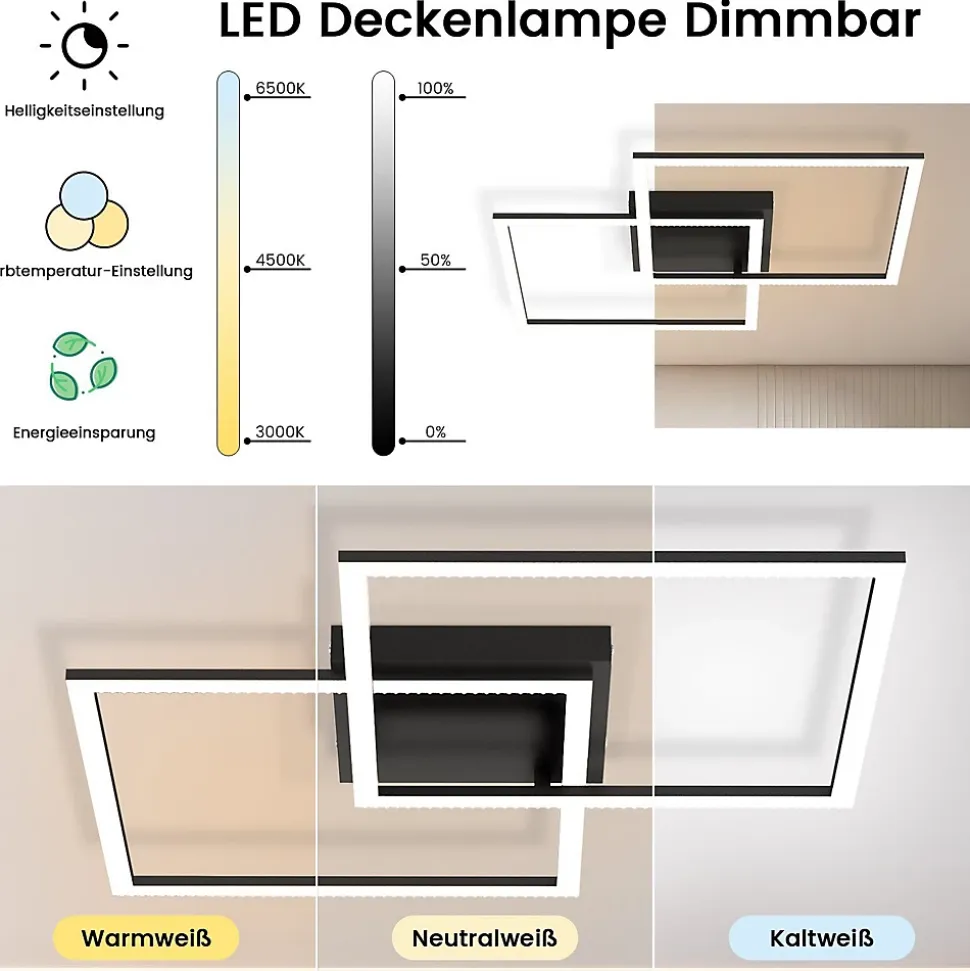 Design géométrique : ce plafonnier LED moderne apporte une solution d’éclairage chic et sophistiquée à votre intérieur avec son design géométrique unique en bande de cristal. Ce design offre non seulement un look élégant, mais également un effet d’éclairage plus doux qui crée une ambiance chaleureuse et moderne dans votre pièce.Télécommande : profitez d’une expérience d’éclairage simple et intelligente avec un contrôle précis de la luminosité et de la température de couleur via la télécommande. Avec une large gamme de températures de couleur, de la lumière blanche chaude à 3 000 K à la lumière blanche froide à 6 500 K, et une luminosité réglable, vous pouvez obtenir l’effet d’éclairage idéal pour différentes occasions et moments, de clair à chaud, comme vous le souhaitez.Fonction minuterie : l’introduction de la fonction minuterie intelligente, qui s’éteint automatiquement après une minute, permet non seulement d’économiser de l’électricité, mais vous donne également un sentiment de sécurité. Cette fonction garantit que vous n’aurez pas à vous soucier d’oublier d’éteindre les lumières et apporte plus de commodité et de confort à votre vie.Détails du plafonnier : La puissance est de 52 W, les dimensions sont de 54 x 54 x 7,5 cm, la tension est de 230 V. Le plafonnier est dimmable et la température de couleur varie de 3000 K à 6500 K. Le plafonnier doté de la technologie LED avancée est énergétique. efficace et un bon choix pour le salon et la chambre