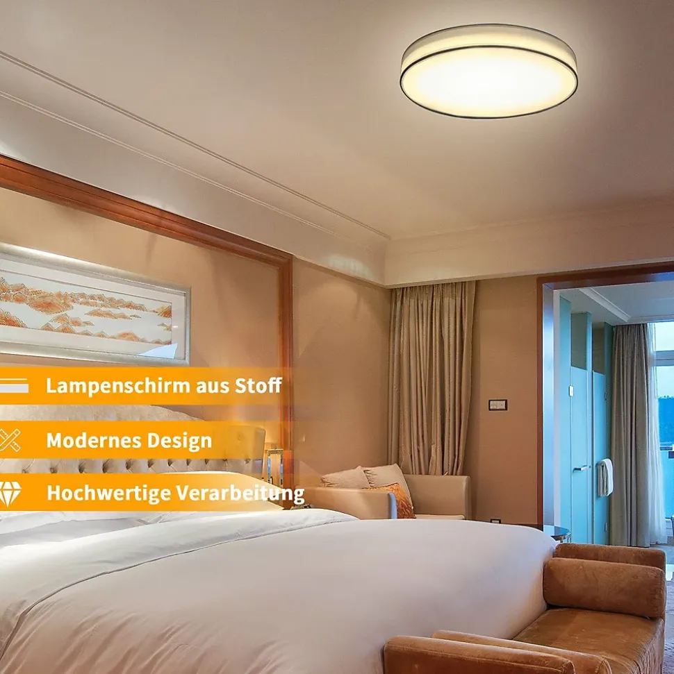 Lumière douce 3 000 K : technologie d’éclairage LED avancée qui fournit des faisceaux de lumière ininterrompus, combinée au plafonnier rond en textile qui ajuste la lumière à un état doux, diffus et sans scintillement pour créer une atmosphère chaleureuse et agréable. De plus, l’éclairage LED n’est pas affecté par les interférences radio et fournit un éclairage stable et durable, ce qui est vraiment le point fort du design de cette lampe de salon.Moderne et élégant : le parapluie en tissu blanc s’intègre parfaitement dans les intérieurs minimalistes et modernes, donnant à vos pièces une atmosphère chaleureuse et ajoutant une touche d’élégance intemporelle. Installez-vous harmonieusement avec ce plafonnier en tissu ! Convient à tout style décoratif d’une pièce.Répartition uniforme de la lumière : l’intensité lumineuse émise par le couvercle LED est uniforme et il n’y a aucune irrégularité de luminosité et d’obscurité. Cela crée un éclairage agréable. La lumière peut briller dans tous les coins, afin que les personnes présentes dans cet environnement aient un sentiment de confort et de sécurité et puissent mieux travailler et se reposer. Cela peut également éviter de concentrer la lumière, provoquant ainsi moins de stimulation des yeux.Installation facile : l’installation est simple, rapide et pratique, elle peut gagner du temps d’installation. Il vous suffit de connecter le connecteur d’alimentation au plafonnier et de monter la lampe. Après avoir installé le plafonnier, la distance entre celui-ci et le plafond est relativement étroite afin qu’il n’attire pas l’attention des moustiques et offre ainsi une protection contre les moustiques et autres insectes.Le plafonnier avec revêtement en tissu est un éclairage domestique populaire. Il a un look simple et élégant.