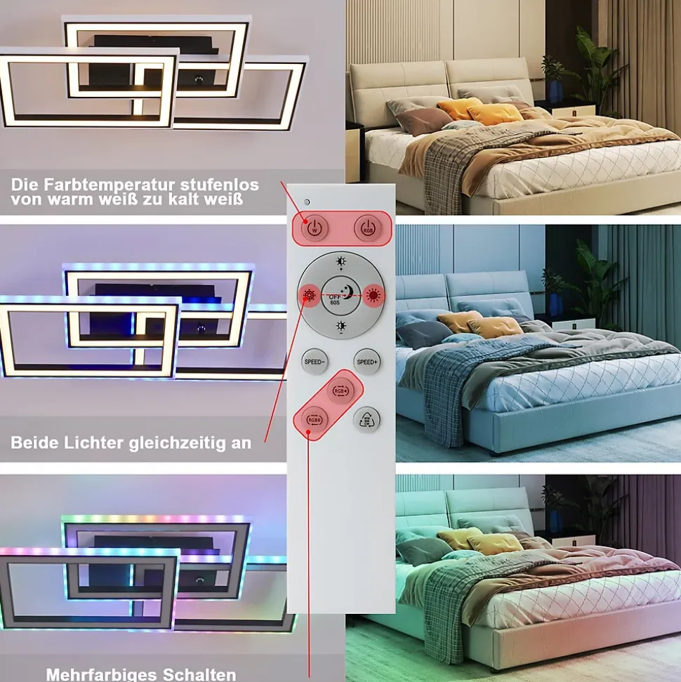 【Design RVB + CCT】 : Ajoutez une touche élégante à votre intérieur avec ce plafonnier LED 45 W de haute qualité et son design géométrique élégant. Utilisez la télécommande pour régler l’éclairage selon vos préférences personnelles. Grâce au matériau avancé de la puce LED, cette lampe est économe en énergie et a une durée de vie allant jusqu’à 25 000 heures. Profitez d’une joie durable grâce à ce plafonnier.【Technologie CCT dimmable】Grâce à la technologie CCT, vous pouvez choisir entre les couleurs de lumière blanc chaud, blanc neutre et blanc froid (3000K à 6000K) avec ce plafonnier et ainsi choisir la couleur de lumière parfaite pour vos besoins. Profitez de réglages d’éclairage confortables selon vos souhaits.【Mode RVB】 : le plafonnier LED à intensité variable offre une variété de modes d’éclairage. Choisissez parmi 13 couleurs ou activez le mode cycle pour un changement de couleur continu. Avec la télécommande, vous pouvez arrêter, démarrer, accélérer ou ralentir l’anneau lumineux pour créer l’atmosphère que vous souhaitez. Ce plafonnier LED permet des réglages d’éclairage polyvalents.【Détails techniques】 Taille totale : 54*34*9 cm ; Tension : 230 V ; Puissance : 45 W ; Intensité variable : oui ; Changement de couleur : oui ; Abat-jour rotatif : oui ; Classe de protection : IP20 ; Matériau : métal et plastique ; Les ampoules LED sont installées de manière permanente et une bonne efficacité énergétique peut être garantie grâce à la technologie LED. La durée de vie est de 25 000 heures.【Service client】 Nous vous offrons une garantie d’achat de 2 ans pour notre éclairage. Notre service client est aussi unique que le design contemporain de nos lampes. Nous attachons une grande importance à la qualité et sommes toujours là pour vous. Si vous avez des questions, n’hésitez pas à nous contacter. Votre satisfaction est notre préoccupation.