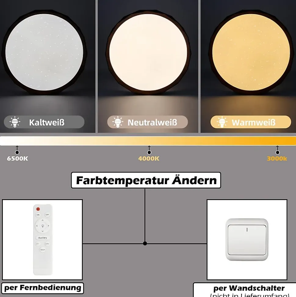 Plafonnier aspect bois : design simple et grand avec un diamètre de Φ40 cm. Le cadre de la lampe est en plastique aspect bois, l’abat-jour est en acrylique hautement transparent. Il offre un éclairage agréable et une sensation naturelle. La lumière douce et translucide offre un confort supplémentaire à vos yeux.【Plafonnier à température de couleur réglable】 Ce plafonnier LED offre 3 options de température de couleur : 3000K blanc chaud pour une ambiance cosy tout en regardant la télévision et en mangeant, 4000K blanc neutre pour améliorer le rendu des couleurs des objets et adapté à toutes les conditions météorologiques, et 6500K Un blanc froid idéal pour l’été et vous aidera à rester plus concentré au travail.【Détails techniques】 Dimensions du plafonnier rétro : 40*40*6,5 cm ; Tension : 230 V, puissance : 43 W ; Intensité variable : oui ; Classe de protection : IP20 ; Matériau : métal et plastique ; Les ampoules LED sont installées de manière permanente et une bonne efficacité énergétique peut être garantie grâce à la technologie LED. La durée de vie est de 25 000 heures.Polyvalent : ce plafonnier décoratif convient non seulement aux couloirs, cuisines, salles à manger et salons, mais également aux retraites telles que les chambres, les chambres d’enfants et les salles d’étude. Il donne à chaque pièce une atmosphère lumineuse très particulière et la complète comme un accessoire unique.【Service après-vente】Nous offrons une garantie d’achat de 2 ans pour l’éclairage. Le produit a été récemment révisé et modernisé, et il existe des cas où les valeurs d’efficacité énergétique ne correspondent pas à la page de détail. Si vous recevez le produit et rencontrez des problèmes, veuillez contacter notre service client.