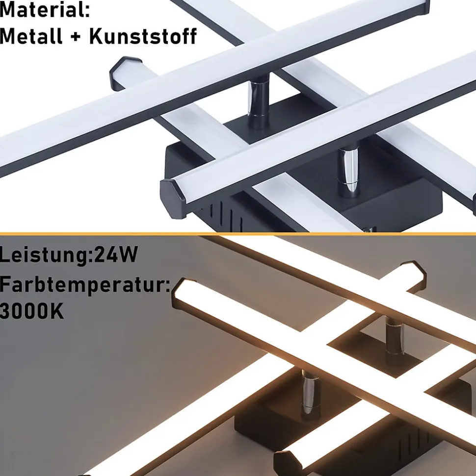 Design moderne : ce plafonnier LED a un design simple avec 4 tubes hexagonaux croisés, qui s’adapte parfaitement au style de mobilier moderne et fournit un éclairage pratique pour votre vie quotidienne.Température de couleur : température de couleur chaude de 3 000 K, lumière douce, proche de la lumière naturelle, sans effet stroboscopique, sans éblouissement, n’irrite pas les yeux et convient à une utilisation à long terme pour créer une atmosphère de vie confortable.Différentes formes : Ce plafonnier est intelligemment conçu. Le module LED de ligne sur l’anneau extérieur peut être tourné pour prendre différentes formes afin de répondre aux différents besoins de bricolage et offrir la meilleure expérience visuelle.Informations sur le produit : Taille 44 x 12 x 6 cm, puissance 24 W, fabriqué en métal et plastique pour garantir durabilité et beauté, adapté à toutes sortes de décorations intérieures.Champ d’application : convient pour le salon, la chambre, la cuisine, le bureau, le couloir et autres décorations intérieures. Son look moderne et son éclairage agréable en font un choix de décoration idéal.