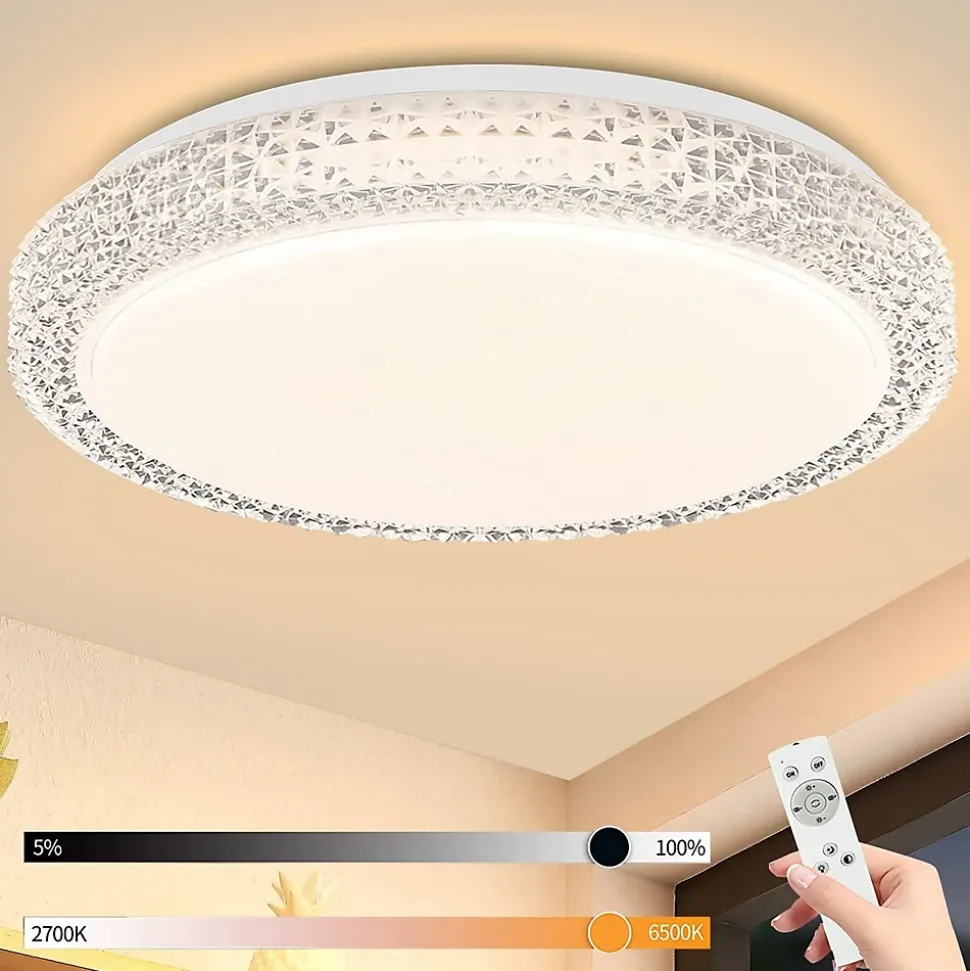 Design créatif : ce plafonnier LED blanc moderne en plastique et métal présente un design élégant qui reflète le ciel étoilé. Le cristal transparent sur le bord rehausse le design du plafonnier. Fonctionnalité et esthétique forment une unité parfaite dans cette lumière.Technologie CCT dimmable : La technologie CCT vous permet de choisir la bonne couleur de lumière entre les couleurs de lumière allant du blanc chaud, blanc neutre au blanc froid (2700 K à 6500 K), en fonction de vos besoins. Et c’est très confortable avec une télécommande incluse dans la livraison.Détails techniques : dimensions : 30 x 30 x 6 cm, tension : 230 V, puissance : 18 W. Les ampoules LED sont installées de manière fixe, grâce à la technologie LED, une bonne efficacité énergétique peut être garantie. La durée de vie est de 25 000 heures.Applications multiples : ce plafonnier décoratif en forme d’étoile blanche de 18 W avec cristaux convient non seulement pour le couloir, la cuisine, la salle à manger, le salon, mais aussi pour les pièces de loisirs telles que les chambres et les chambres d’enfants.Service client : nous offrons une garantie d’achat de 2 ans pour l’éclairage, le produit a été récemment révisé et modernisé et il existe des cas où les valeurs d’efficacité énergétique ne correspondent pas à la page détaillée. Si vous recevez le produit et rencontrez des problèmes, veuillez contacter notre service client.