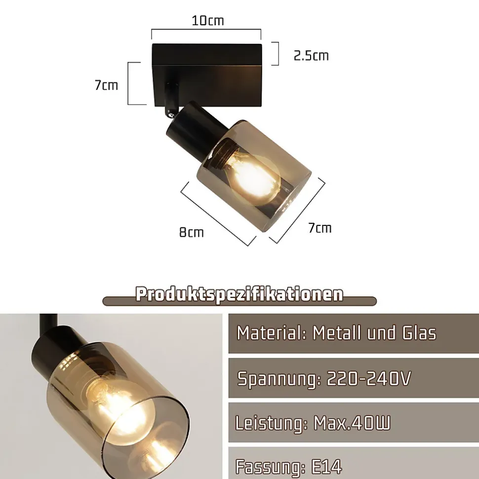 éléments en verre et en métal pour un look de haute qualité : la combinaison du verre et du métal confère à ce spot un aspect de haute qualité. Grâce à son design simple et à sa palette de couleurs gris et noir, il s’intègre parfaitement dans n’importe quel style de décoration intérieurealignement flexible : le spot dispose également d’une plage de rotation de 350° horizontalement et de 90° verticalement pour diriger la lumière avec précision. Grâce aux propriétés pivotantes et rotatives, vous pouvez régler la lumière individuellement et éclairer vos pièces de manière optimaleparamètres du produit : matériau : métal et verre ; douille : e14 (max. 25w) ; dimensions du produit : plaque de plafond : 10*7*2,5 cm ; abat-jour : 8*7cm ;; tension : 230 v ; couleur : noir ; contenu de la livraison : ampoule non incluseapplications polyvalentes : le spot de plafond convient à diverses applications, que ce soit dans le salon, la chambre, le couloir ou le bureau. Qu’il soit utilisé comme source lumineuse principale ou comme éclairage d’appoint, le spot de plafond est un élément d’éclairage polyvalent et pratique.installation facile : le spot de plafond est facile à installer et peut être installé dans n’importe quelle pièce. Grâce à son design clair et intemporel, le spot de plafond s’intègre dans différents styles d’intérieur et crée une atmosphère agréable