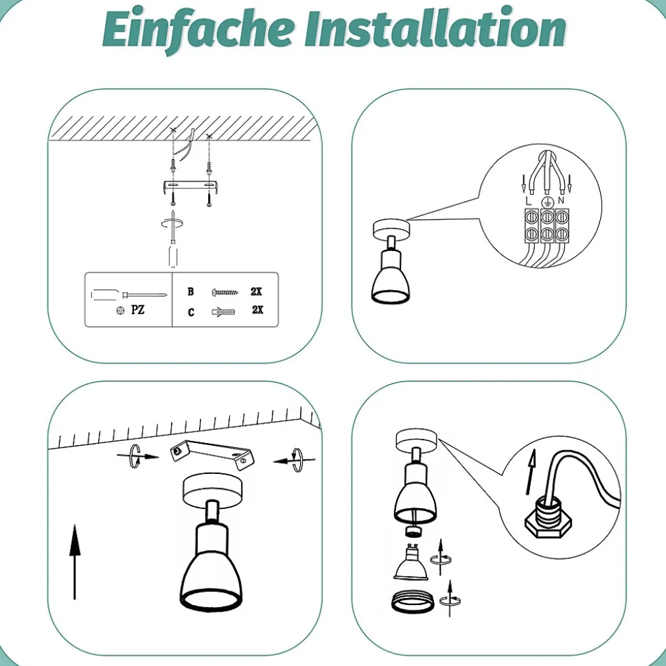 DESIGN MODERNE : Ce spot de plafond est fabriqué en métal noir robuste, résistant à l’humidité et à la rouille. Le design minimaliste et élégant donne à votre pièce une touche moderne et décorativeHAUTE FLEXIBILITÉ : Les spots de plafond peuvent être réglés de haut en bas de 180° et pivotés de 355°. Cela permet un éclairage ciblé de différentes zones de la pièce et répond aux besoins d’éclairage individuels pour créer un environnement lumineux agréable.AMPOULES INTERCHANGEABLES : Le spot de plafond pour couloir est compatible avec les lampes GU10 jusqu’à 40 W maximum. Selon vos besoins, vous pouvez choisir entre des lampes GU10 blanc chaud, blanc froid ou RGB. Veuillez noter que les ampoules ne sont pas inclusesAPPLICATIONS POLYVALENTES : Ce plafonnier moderne peut également être utilisé comme applique murale ou comme spot de plafond et convient aussi bien à l’éclairage ciblé qu’à l’éclairage général de la pièce. Idéal pour différentes pièces comme le salon, la chambre, le couloir, la chambre d’enfant, la cuisine et le balcon.DIVERSES OPTIONS ET SERVICE COMPLET : Les spots de plafond GU10 sont disponibles en noir et blanc et sont disponibles en versions avec 1, 2, 3, 4, 5 ou 6 têtes de lampe ainsi qu’en version ronde 3 têtes et carrée 4 têtes. Il est livré avec du matériel de montage et des instructions d’installation détaillées. De plus, nous offrons un service client complet et une assistance en ligne pour vous aider en cas de questions ou de problèmes d’installation.