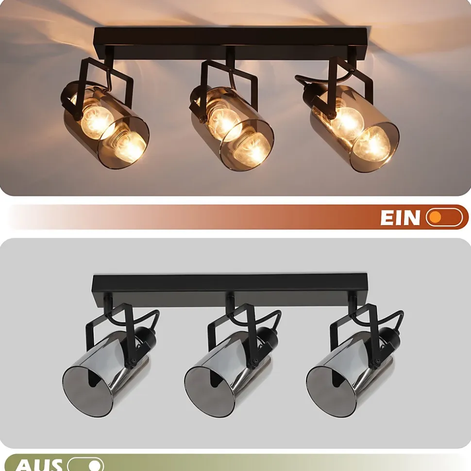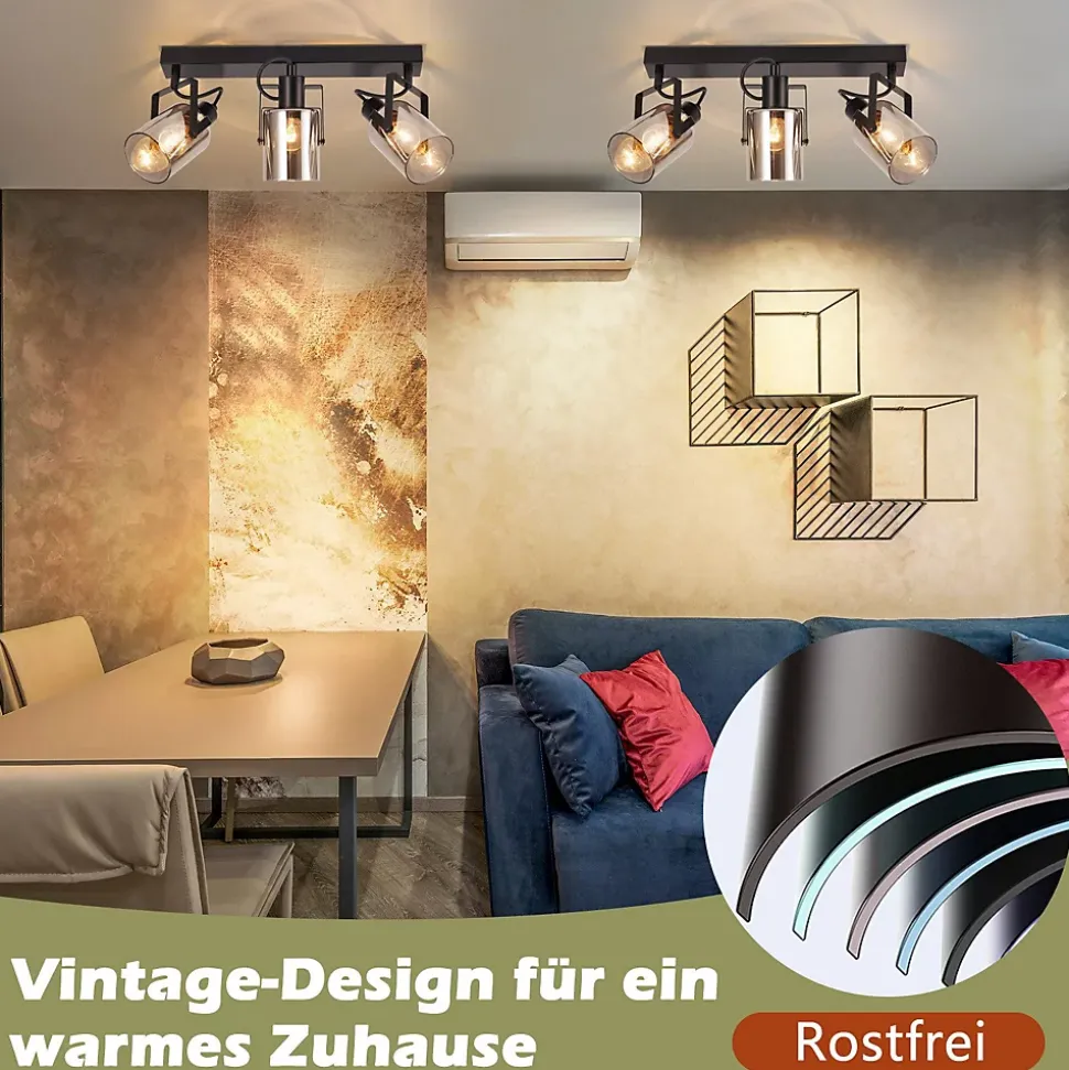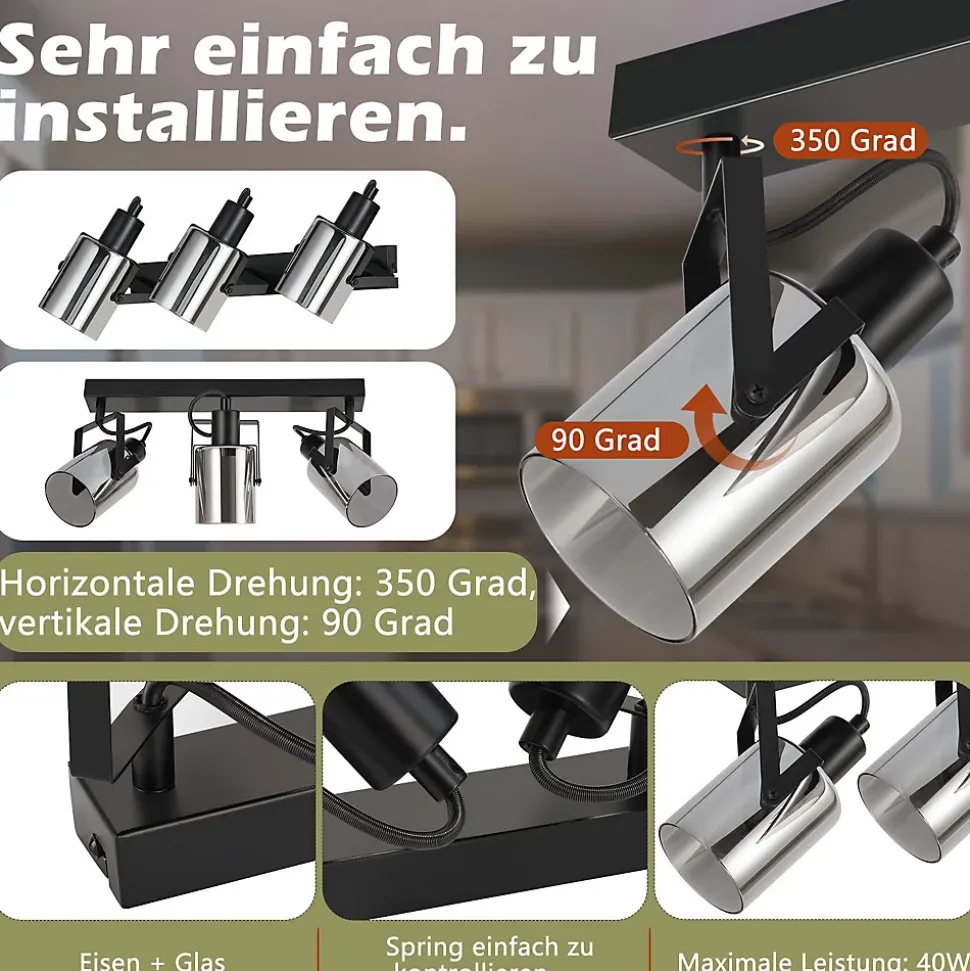 Design : Le verre gris fumé présente un style industriel sophistiqué et minimaliste, donnant à la pièce une touche design unique qui attire immédiatement le regardRotatif : nos spots de plafond peuvent pivoter de 350 degrés horizontalement et de 90 degrés verticalement pour ajuster l’angle. Cela vous permet d’éclairer les zones que vous souhaitez et de créer une atmosphère confortableSource de lumière interchangeable : le spot est équipé d’un culot E14, qui vous permet de remplacer de manière flexible diverses sources de lumière E14 telles que les ampoules vintage, modernes, dimmables et RVB, répondant pleinement à vos besoins de bricolage.Matériaux de haute qualité : le spot de plafond est fabriqué en fer et en verre de haute qualité, est antirouille, facile à installer et à nettoyer. Le spot allie à la fois le design cosy et nostalgique et le style industriel moderne et met en valeur votre intérieur.Application polyvalente : le spot de plafond convient à une variété de scénarios, notamment la chambre, le salon, la cuisine, la salle à manger, le couloir, le café, le bureau, l’hôtel et plus encore. (Remarque : notre produit ne contient pas d’ampoules)