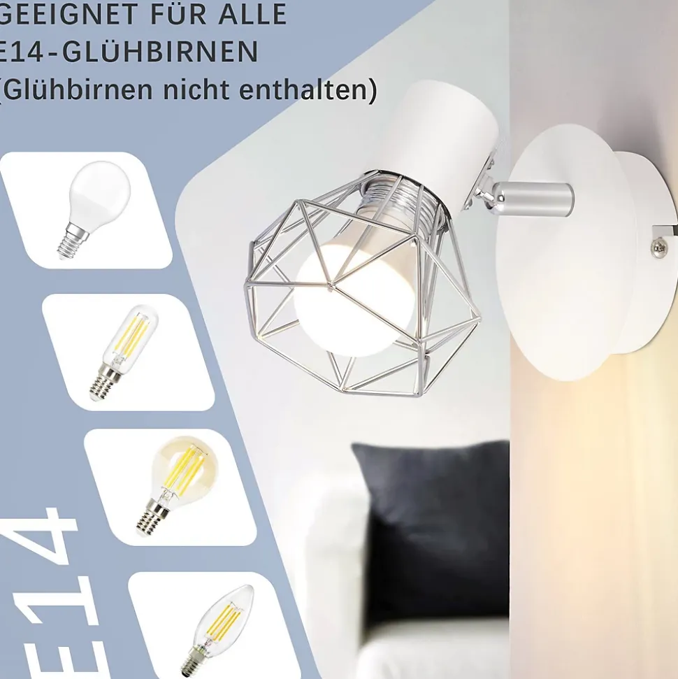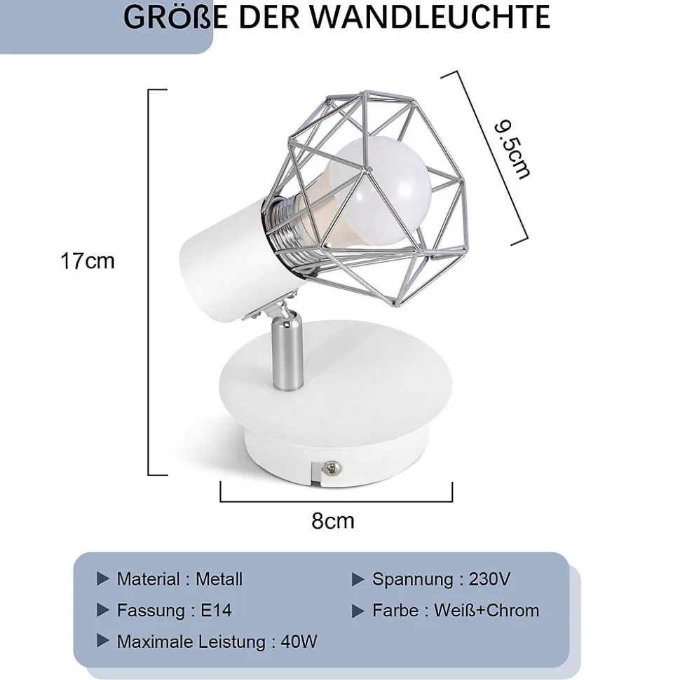【Matériaux de haute qualité】 Le spot de plafond à 1 ampoule au design vintage pour usage intérieur est livré avec un abat-jour en maille métallique blanche, ce qui donne à cette applique murale d’intérieur rustique un look vintage unique qui ne se décolore pas facilement. Le pied est également en fil d’acier et est donc très robuste et durable. Le spot mural industriel est idéal pour l’éclairage intérieur.【Spots orientables】Avec cette applique murale vintage E14, vous pourrez ajuster la zone d’éclairage selon vos besoins en ajustant la tête pour mieux éclairer la pièce. L’angle réglable maximum de la tête est de 350° à gauche et à droite et de 90° de haut en bas, ce qui peut répondre aux différents besoins d’éclairage des différentes pièces.【Douille standard E14】 Ce spot mural d’intérieur convient à toutes les ampoules E14 (MAX.40W), par ex. Par exemple, lampes à économie d’énergie, ampoules, tension 220-240 V, classe de protection IP20, convient uniquement pour une utilisation en intérieur (les ampoules ne sont pas incluses).【Spots de plafond pour toutes les occasions】 Avec son design rétro simple, cette applique murale blanche peut être intégrée dans de nombreuses pièces et fournit un éclairage élégant et fonctionnel dans les couloirs, les cages d’escalier, les chambres, les salons et salles à manger, les couloirs, les cafés, les bars, les restaurants, les hôtels. ainsi que des salles d’étude. L’emplacement d’installation peut être choisi en fonction de vos besoins réels.【Installation facile】 Ce spot mural est livré avec tous les accessoires de montage (ampoules non incluses) et peut être installé rapidement et facilement.