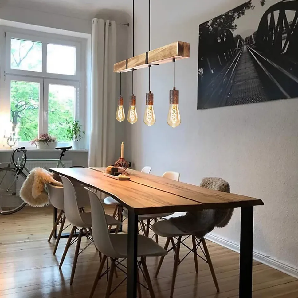 Design rustique & vintage : Cette suspension ancienne se compose d’une poutre en bois de pin suspendue à deux câbles, sur laquelle se trouvent quatre douilles métalliques rétro E27. Il allie charme rustique et style contemporain pour créer une pièce saisissante qui offre la finition parfaite pour un salon ou une salle à manger.Douille E27 : Ce spot de plafond en bois offre une douille E27 et s’adapte aux ampoules E27 normales d’un maximum de 25 watts. Le fait que la lumière soit dimmable dépend de l’ampoule. Attention, cette suspension est livrée sans ampoule. En raison de leurs économies d’énergie et de leur longévité, nous recommandons l’ampoule LED.Détails : Matériau : bois et métal ; Taille de la poutre en bois : 80*6*6 cm ; Taille de la plaque de plafond : 35*8*3 cm ; Câble de suspension : 150 cm ; Prise : E27 (max. 25 W) ; Tension : 230 V ; Type/forme : allongé ; Ampoules incluses : non ; Type de montage : plafond ; En outre : les ampoules peuvent être remplacées150 cm réglable en hauteur de manière flexible : si nécessaire, la hauteur de la lampe de salle à manger en bois peut être réglée jusqu’à un maximum de 150 cm, de sorte qu’il y a suffisamment de place pour un agencement décoratif à différentes hauteurs. Veuillez NOTER : en raison de l’espace limité de la plaque de plafond du plafonnier, si vous devez régler une longueur plus courte (entre 10 cm et 140 cm), vous devez couper le câble. , comme au-dessus d’un bar dans un restaurantVeuillez noter qu’en raison du traitement personnalisé, la technique de combustion du charbon de bois peut varier, ce qui signifie que vous pouvez recevoir des finitions différentes. Le bois, un matériau naturel, peut avoir différentes couleurs et la surface peut être lisse ou rugueuse. Il se peut que vous receviez une lampe dont la texture ne répond pas à vos attentes. Dans ce cas, merci de nous contacter afin que nous puissions organiser un échange pour vous.