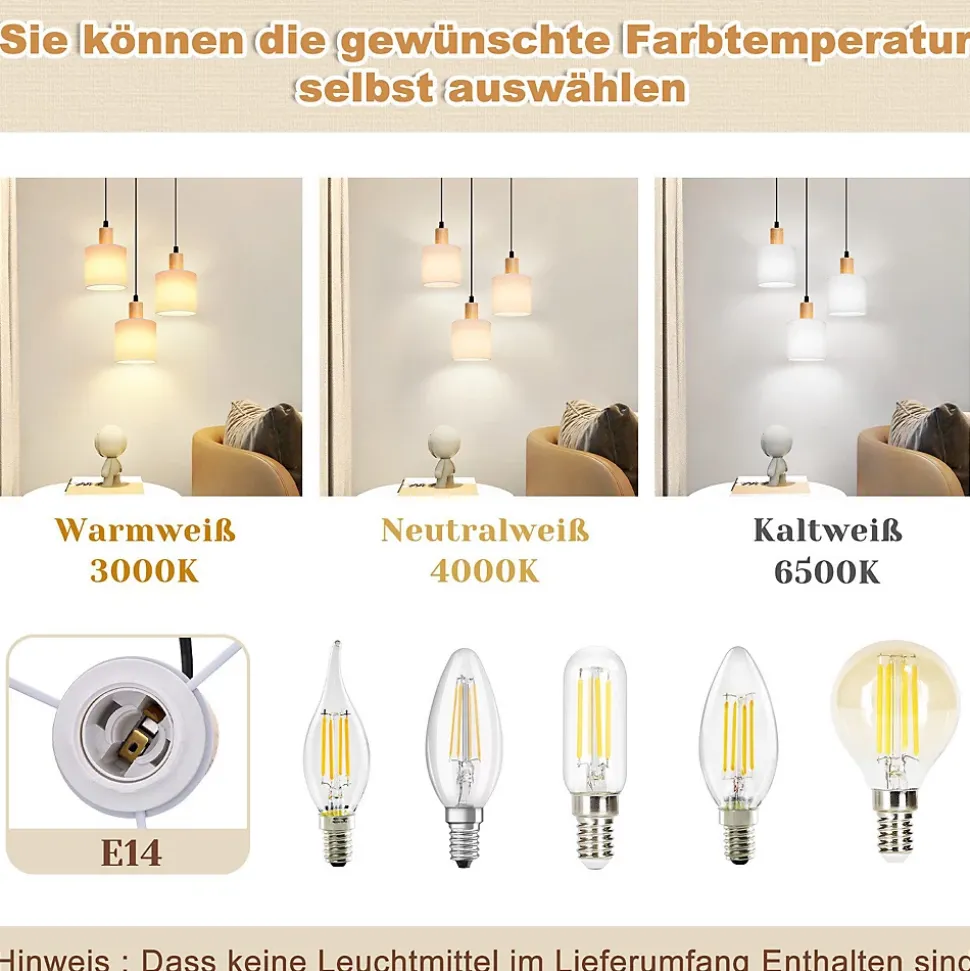 【Lampe en bois et tissu】Cette suspension à 3 ampoules se compose d’un socle en bois et de trois abat-jour de longueurs différentes. Le parasol blanc est simple et élégant, il s’adapte mieux aux différents espaces de vie et apporte un pur confort à votre maison. La combinaison moderne d’abat-jour en bois, en métal et en tissu rend cette lampe de table à manger moderne idéale pour les espaces de vie modernes.【Douille E14 standard】Cette suspension de salle à manger dispose d’une douille E14 et convient à toutes les ampoules E14 standard. Nous recommandons d’utiliser une ampoule jaune chaud pour rehausser l’apparence du bois. Attention : nos produits sont livrés sans ampoules. Vous pouvez choisir différents types d’ampoules LED, d’ampoules et d’ampoules colorées pour décorer votre pièce à votre guise.【Hauteur réglable】Cette lampe de table à manger suspendue en bois peut être librement ajustée dans la longueur de la corde avant et après l’installation, jusqu’à 150 cm. 【Large gamme】Cette suspension vintage a de nombreuses formes à choisir, vous pouvez mélanger et assortir comme vous le souhaitez, n’importe quelle combinaison. Cette lampe à suspension de salle à manger moderne suspendue au-dessus de la salle à manger, de la table à manger, du salon, de la cuisine, du couloir, du balcon, de la chambre à coucher, du bureau à la maison est un point culminant d’éclairage particulier. Il est également idéal pour les espaces commerciaux et d’exposition, tels que les bars, cafés, bureaux, bars alimentaires et autres lieux.【Installation et expédition】Cette lampe suspendue de cuisine comprend des instructions et toutes les pièces d’installation à l’intérieur, elle peut être facilement installée selon les instructions d’installation. Le plafond en bois peut être usé pendant le processus de fabrication et d’expédition, ce qui est normal. Si vous recevez le produit avec des problèmes, veuillez nous contacter à temps, nous vous donnerons une réponse satisfaisante.