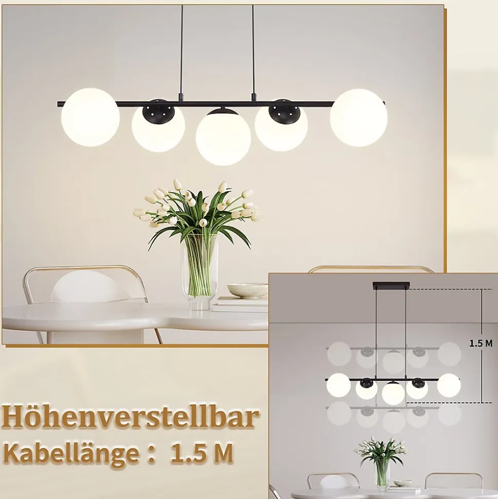 Décoration esthétique : la lampe à suspendre a un design minimaliste, moderne et élégant. Elle confère style et beauté à l’intérieur. Qu’il s’agisse d’une maison ou d’un espace commercial, la lampe suspendue à boule de verre peut devenir un point de mire et créer une atmosphère unique.Lumière douce : avec des boules de verre blanc laiteux, le design permet une lumière douce et uniforme. Comparée à la lumière directe, la lumière douce est plus agréable et réduit l’éblouissement et l’irritation des yeux afin de protéger la santé oculaire.Différentes sources lumineuses au choix : Avec une douille E27, la lampe offre la possibilité d’utiliser différents types de sources lumineuses comme les ampoules LED, les ampoules à incandescence et les ampoules à économie d’énergie. De cette manière, vous pouvez choisir la source lumineuse qui vous convient le mieux, en fonction de vos préférences et de vos besoins, et obtenir le résultat d’éclairage souhaité.Hauteur réglable : la hauteur de la lampe suspendue est réglable, ce qui vous permet d’adapter la position et la hauteur en fonction de vos besoins. Cette flexibilité permet non seulement d’obtenir une plus grande surface d’éclairage et des effets de lumière, mais aussi de s’adapter à différents espaces et besoins.Service après-vente : Si vous avez des questions sur nos lampes, n’hésitez pas à nous contacter à tout moment. Nous vous répondrons dans les 24 heures. Si vous avez d’autres questions, veuillez cliquer sur « Contacter le vendeur » pour entrer en contact avec nous. Nous ferons de notre mieux pour résoudre votre problème.