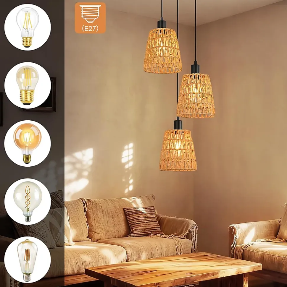 Matériaux de Haute Qualité : Cette suspension vintage est fabriquée en rotin naturel et en métal robuste. L’abat-jour intègre harmonieusement les éléments en rotin. Elle s’adapte parfaitement aux styles maison de campagne, rustique, bohème et rétro, apportant une touche naturelle à votre intérieur.Spécifications du Produit : Ce luminaire mesure 120 x 25 x 25 cm, avec un socle de Ø 25 cm et un abat-jour de Ø 18 cm. Puissance max : 25 W, tension : 220–240 V AC. Le câble est réglable jusqu’à 120 cm pour s’adapter à vos besoins.Douille Standard : Cette suspension de style industriel séduit par son design en cage métallique enveloppée de corde de chanvre. La douille est compatible avec toutes les ampoules E27 (non incluses), telles que les ampoules LED et Edison.Installation Facile : Ce lustre vintage se distingue par sa conception simple. Le câble ajustable permet d’adapter la hauteur à votre plafond. L’installation est rapide grâce aux accessoires fournis ; aucun matériel supplémentaire n’est nécessaire.Polyvalence : Cette suspension en rotin diffuse la lumière vers l’extérieur, créant un charmant effet lumineux. Elle est idéale pour la salle à manger, le salon, le couloir, la chambre, le bureau, l’hôtel, le café ou le bar, créant une atmosphère chaleureuse.