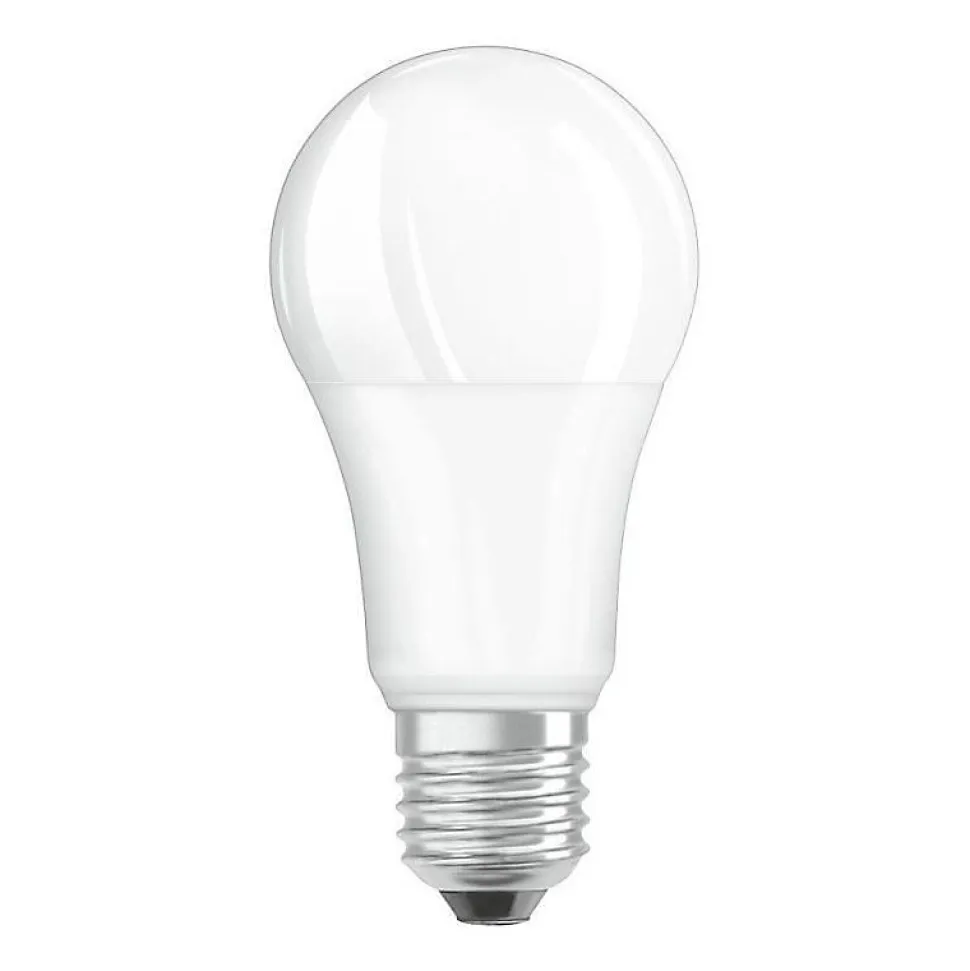 OSRAM Ampoule LED Standard dépoli radiateur variable 13W=100 E27 1521 Lumens Blanc chaud. L’ampoule LED OSRAM Standard Dépolie 13W=100W E27 allie efficacité énergétique et puissance lumineuse. Avec une consommation de seulement 13 kWh/1000h (classe F), elle remplace avantageusement les ampoules à incandescence 100W tout en réduisant votre facture d’électricité. Son flux lumineux de 1521 lumens assure un éclairage chaleureux et uniforme. Grâce à son verre dépoli anti-éblouissement et sa température de couleur blanc chaud (2700K), cette ampoule diffuse une lumière apaisante idéale pour les pièces de vie. Conçue pour durer jusqu’à 15 000 heures, elle résiste aux chocs et vibrations grâce à son radiateur intégré optimisant la dissipation thermique. Avec son culot E27 standard, cette ampoule LED s’installe instantanément dans la plupart des luminaires existants sans modification. Son format compact (118 mm de hauteur) et son design sobre s’intègrent discrètement dans toutes les lampes et appliques murales. La technologie LED OSRAM garantit un allumage instantané à pleine puissance sans clignotement. Sans UV ni infrarouge, cette ampoule préserve les couleurs des objets éclairés tout en restant froide au toucher, même après plusieurs heures d’utilisation.