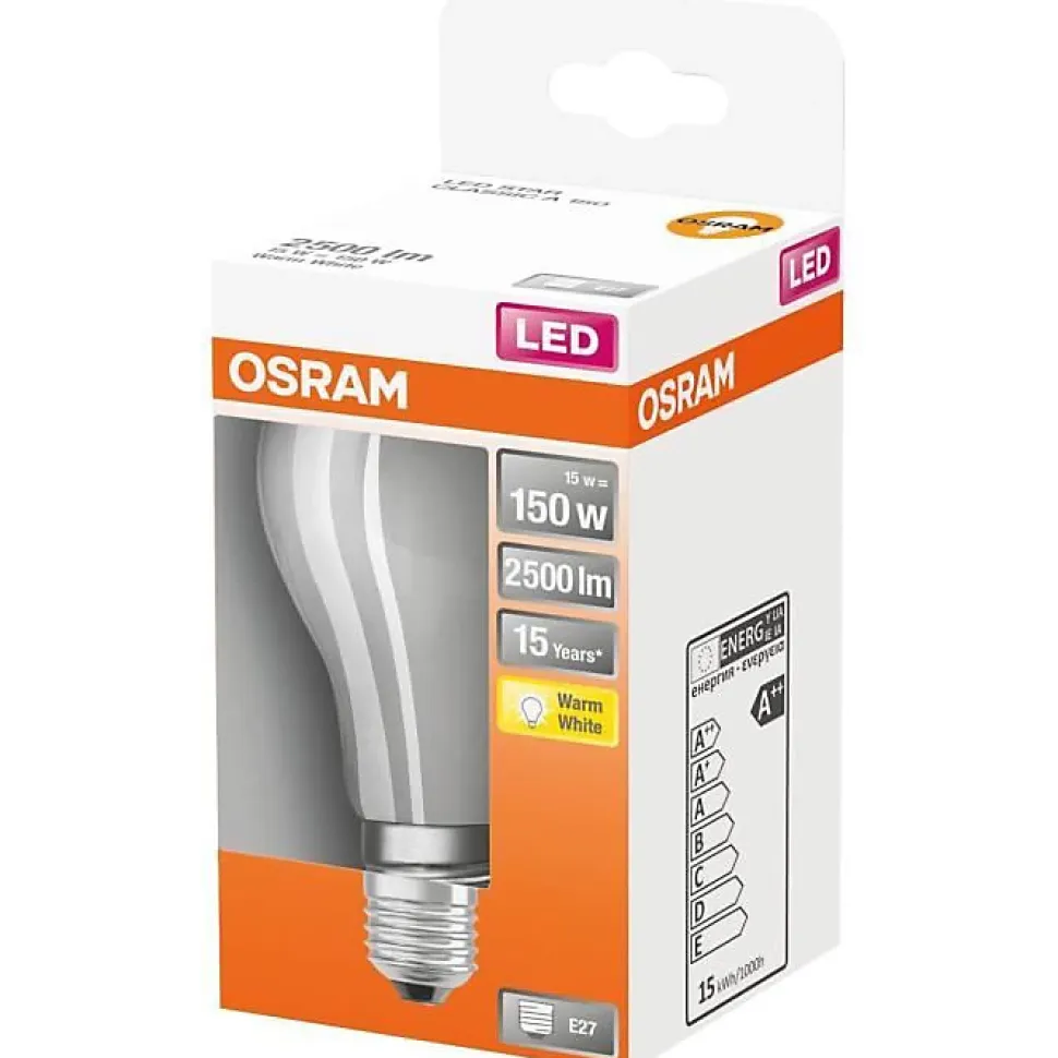 Cette ampoule LED OSRAM de 16W avec un culot E27 est idéale pour remplacer une ampoule traditionnelle de 150W. Elle offre une lumière chaude de 2700K et une luminosité de 2500lm. Sa durée de vie est jusqu’à 15 000 heures et elle ne contient pas de mercure.