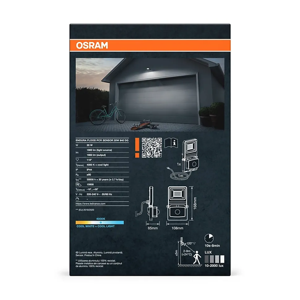 Ce projecteur LED OSRAM ENDURA FLOOD PC de 20 W avec capteur délivre 1800 lumens en blanc froid 4000 K. Son boîtier robuste, certifié IP44, convient aux espaces extérieurs couverts. Grâce à son détecteur de mouvement IR, ce projecteur fonctionne comme un éclairage de sécurité. La durée et le niveau de luminosité réglables permettent un fonctionnement à la demande. La technologie de capteur permet d’économiser jusqu’à 80 % d’énergie.